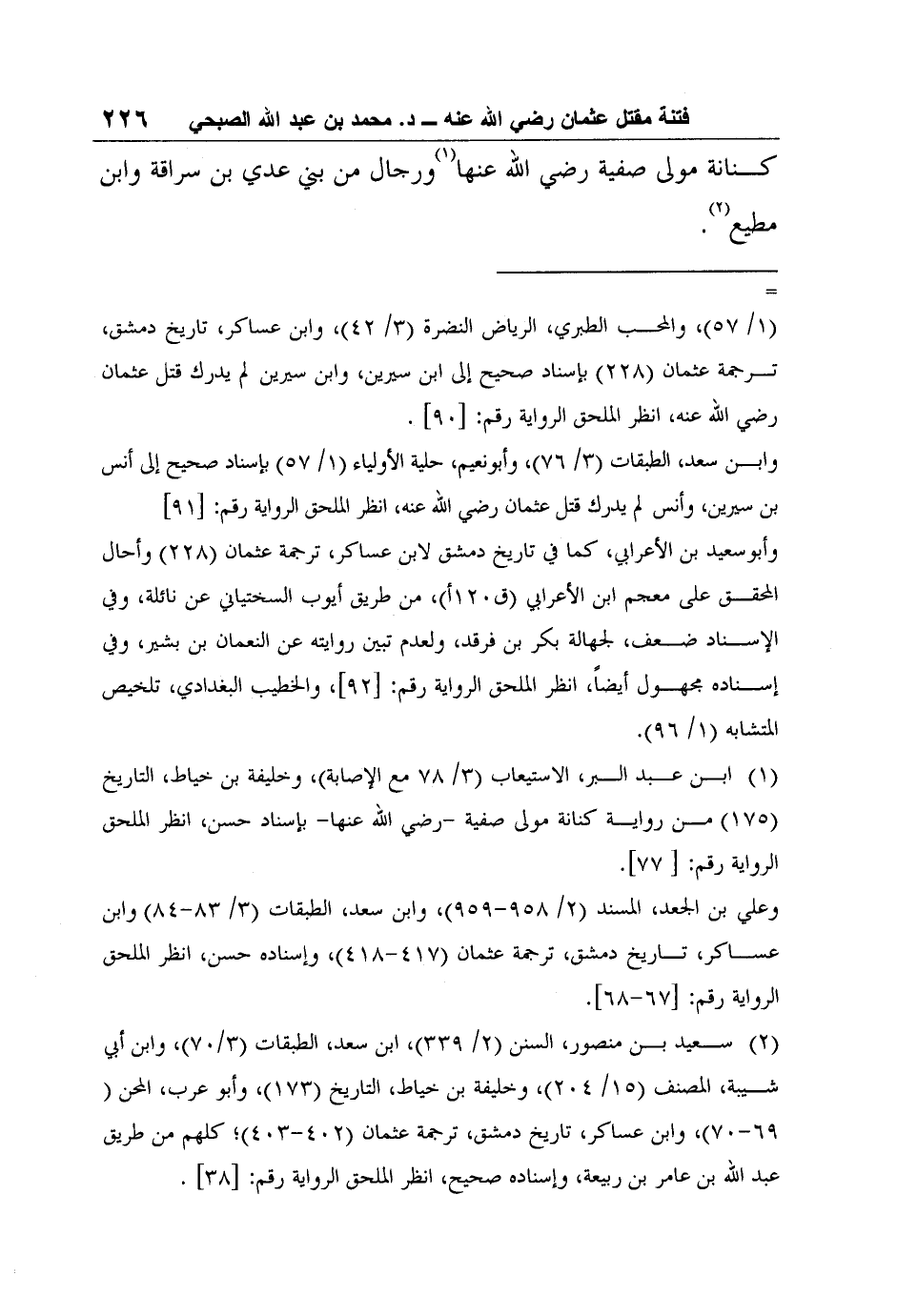 1 ابن عبد البر، الاستيعاب (3/ 78 مع الإصابة) ، وخليفة بن خياط، التاريخ (175) من رواية كنانة مولى صفية -رضي الله عنها- بإسناد حسن، انظر الملحق الرواية رقم: [77] .