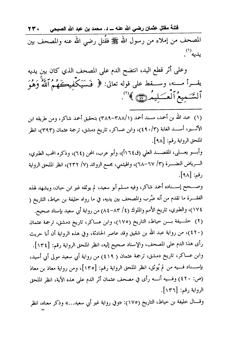 وابن عساكر، تاريخ دمشق، ترجمة عثمان (419) من رواية أبي سعيد مولى أبي أسيد، بإسناد فيه من لم يُوثق، انظر الملحق الرواية رقم: [135] ، ومن رواية معاذ بن معاذ (ص: 420) وفيه أنه رأى في مصحف عثمان أثر الدم على هذه الآية، انظر الملحق الرواية رقم: [136] .