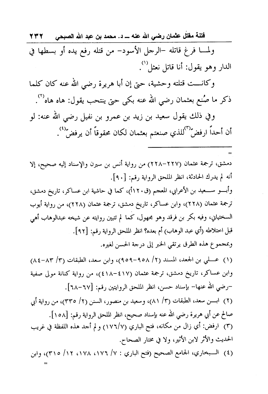 4 البخاري، الجامع الصحيح (فتح الباري: 7/ 176، 178، 12/ 315) ، وابن سعد، الطبقات (3/79) ، وابن أبي شيبة، المصنف (15/205) ، وخليفة بن خياط، التاريخ (176-177) ، وأحمد بن حنبل، فضائل الصحابة (1/278) ، والطبراني، المعجم الكبير (1/84) ، وابن عساكر، تاريخ دمشق، ترجمة عثمان (485-486) من رواية قيس بن أبي حازم، عن سعيد رضي الله عنه، انظر الملحق الرواية رقم: [33] .
