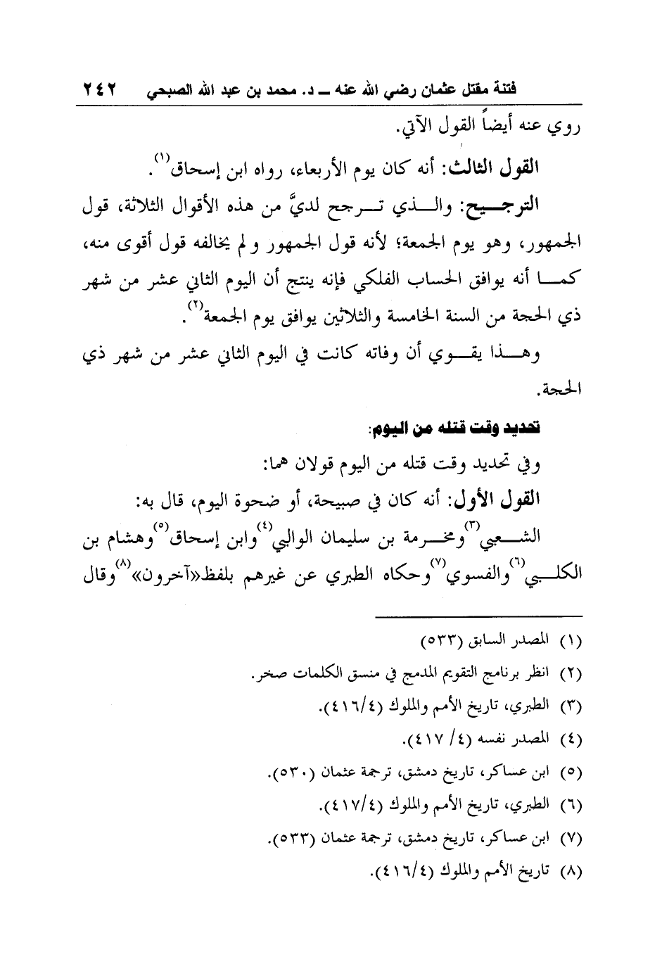 الترجيح: والذي ترجح لديَّ من هذه الأقوال الثلاثة، قول الجمهور، وهو يوم الجمعة؛ لأنه قول الجمهور ولم يخالفه قول أقوى منه، كما أنه يوافق الحساب الفلكي فإنه ينتج أن اليوم الثاني عشر من شهر ذي الحجة من السنة الخامسة والثلاثين يوافق يوم الجمعة2.
