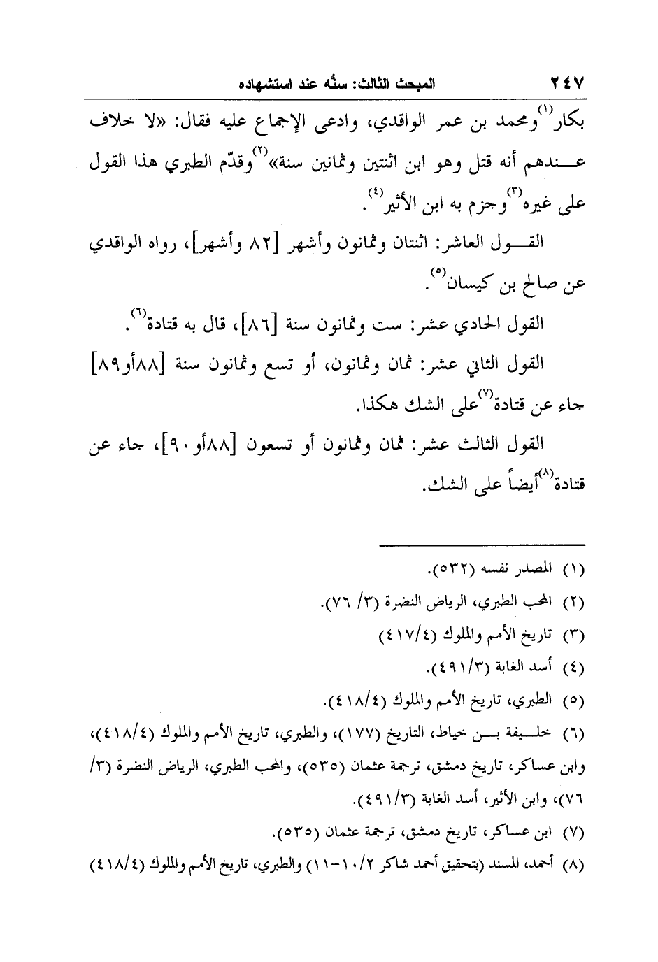 بكار1 ومحمد بن عمر الواقدي، وادعى الإجماع عليه فقال: "لا خلاف عندهم أنه قتل وهو ابن اثنتين وثمانين سنة"2 وقدّم الطبري هذا القول على غيره3 وجزم به ابن الأثير4.