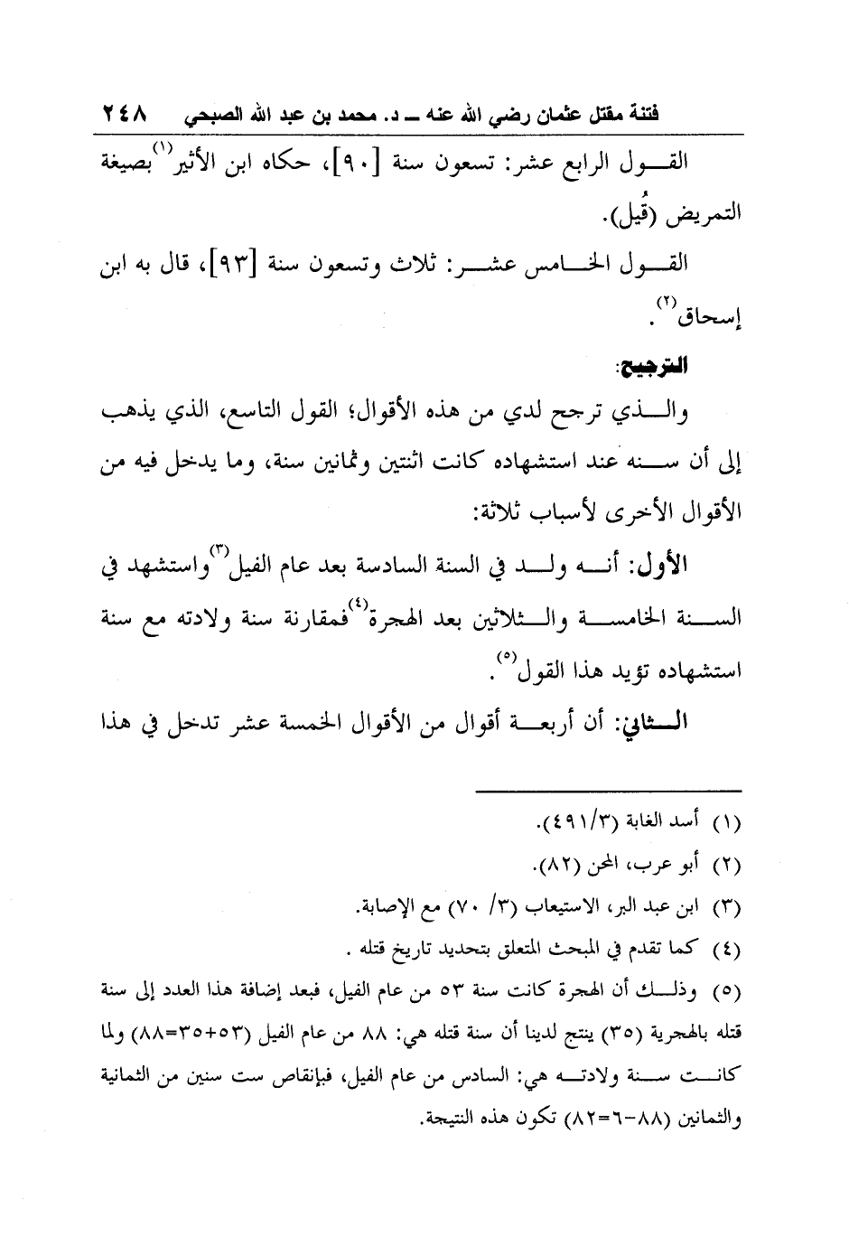 والذي ترجح لدي من هذه الأقوال؛ القول التاسع، الذي يذهب إلى أن سنه عند استشهاده كانت اثنتين وثمانين سنة، وما يدخل فيه من الأقوال الأخرى لأسباب ثلاثة: