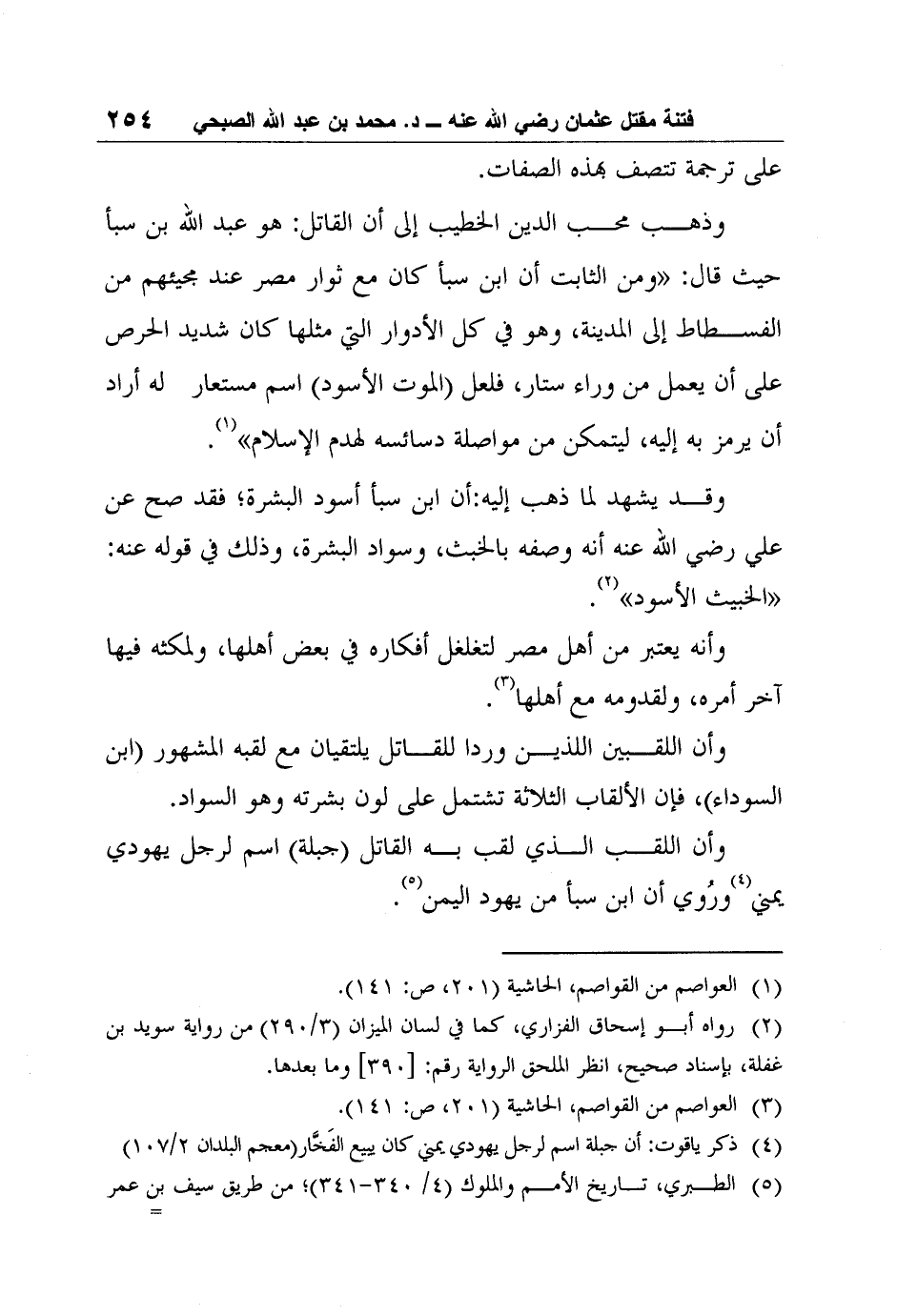 5 الطبري، تاريخ الأمم والملوك (4/ 340-341) ؛ من طريق سيف بن عمر التميمي: أن عبد الله بن سبأ كان يهودياً من أهل صنعاء، أمه سوداء ... ، وإسناده ضعيف، انظر الملحق الرواية رقم: [305] .