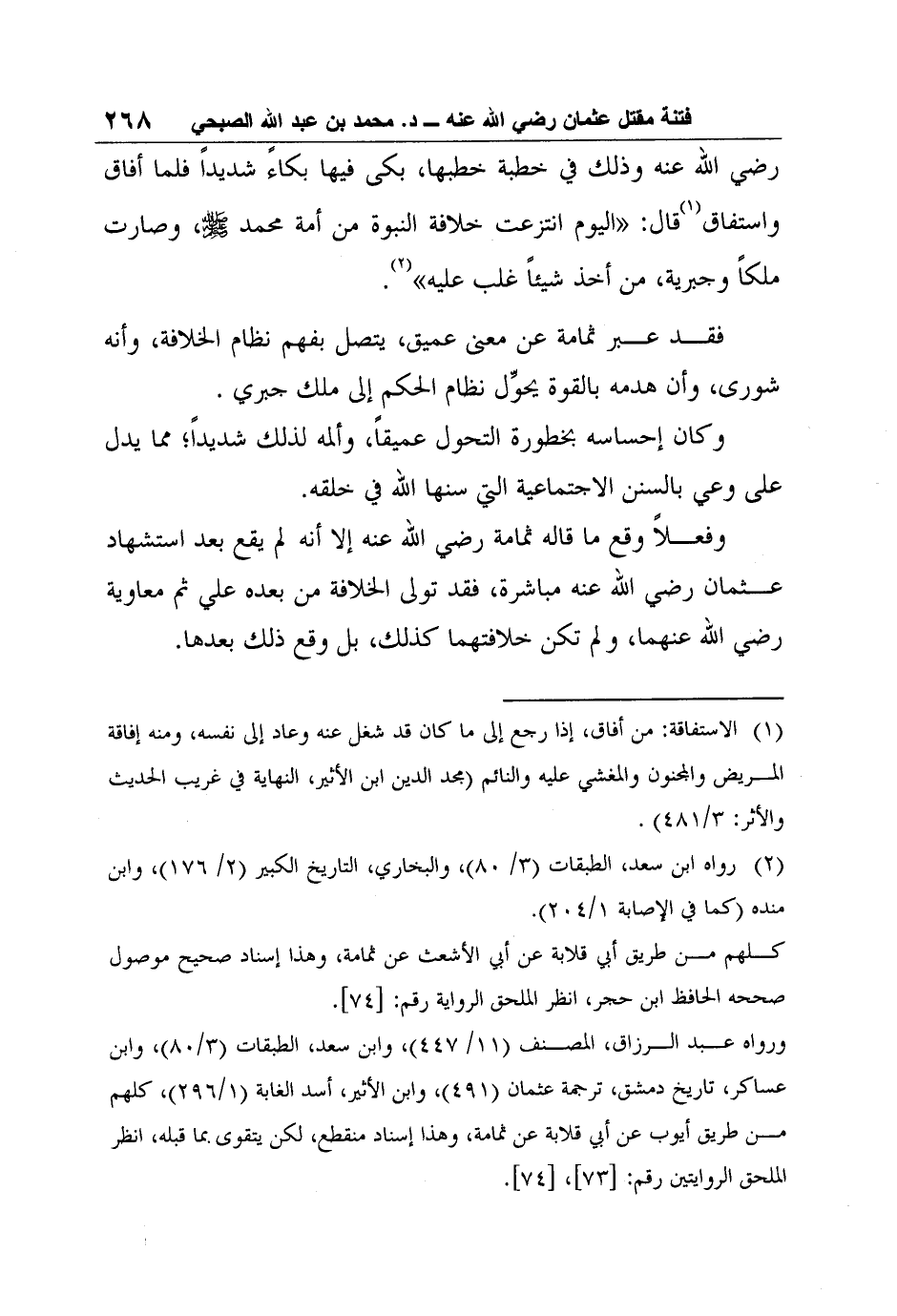 ورواه عبد الرزاق، المصنف (11/ 447) ، وابن سعد، الطبقات (3/80) ، وابن عساكر، تاريخ دمشق، ترجمة عثمان (491) ، وابن الأثير، أسد الغابة (1/296) ، كلهم من طريق أيوب عن أبي قلابة عن ثمامة، وهذا إسناد منقطع، لكن يتقوى بما قبله، انظر الملحق الروايتين رقم: [73] ، [74] .
