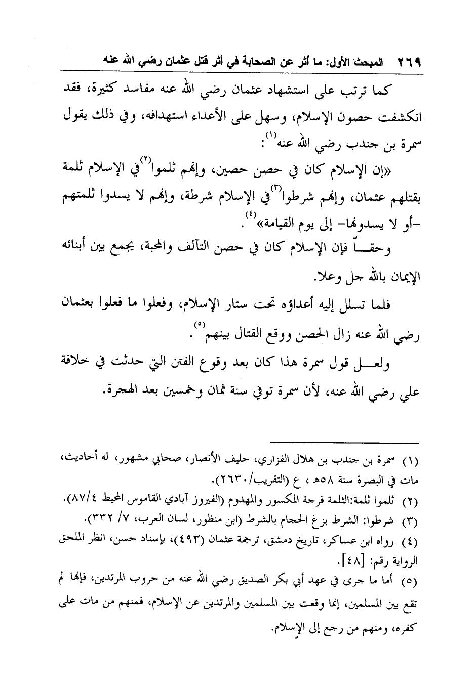 4 رواه ابن عساكر، تاريخ دمشق، ترجمة عثمان (493) ، بإسناد حسن، انظر الملحق الرواية رقم: [48] .
