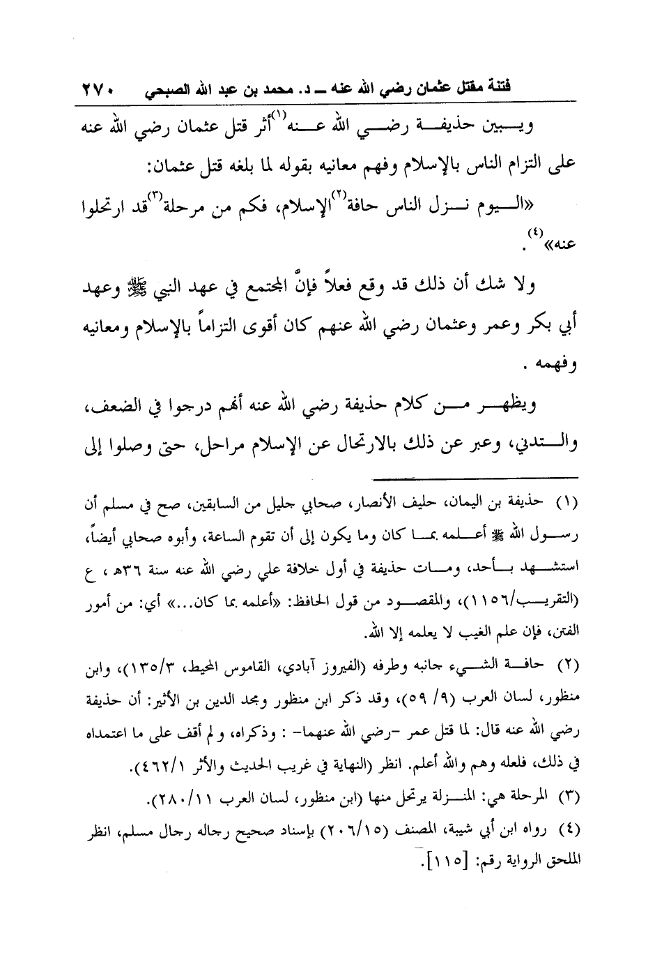 ويبين حذيفة رضي الله عنه1 أثر قتل عثمان رضي الله عنه على التزام الناس بالإسلام وفهم معانيه بقوله لما بلغه قتل عثمان: "اليوم نزل الناس حافة2 الإسلام، فكم من مرحلة3 قد ارتحلوا عنه"4.