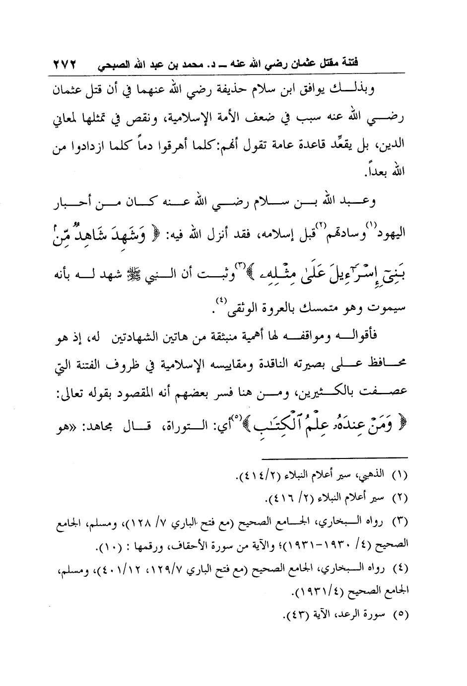 فأقواله ومواقفه لها أهمية منبثقة من هاتين الشهادتين له، إذ هو محافظ على بصيرته الناقدة ومقاييسه الإسلامية في ظروف الفتنة التي عصفت بالكثيرين، ومن هنا فسر بعضهم أنه المقصود بقوله تعالى: {وَمَن عِنْدَهُ أُمُّ الْكِتَابِ} 5 أي: التوراة، قال مجاهد: "هو