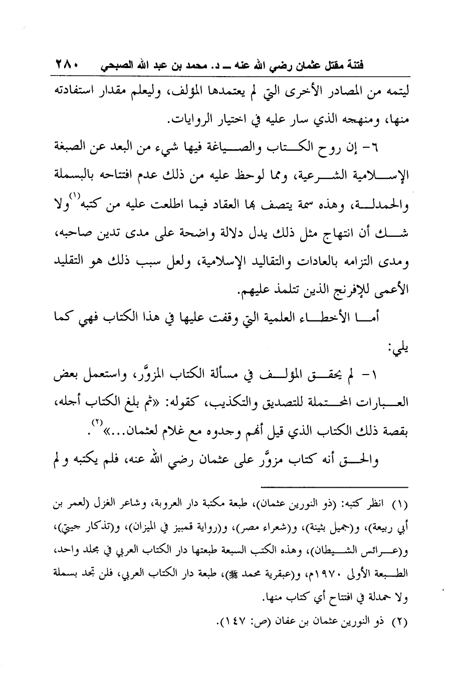 1- لم يحقق المؤلف في مسألة الكتاب المزوَّر، واستعمل بعض العبارات المحتملة للتصديق والتكذيب، كقوله: "ثم بلغ الكتاب أجله، بقصة ذلك الكتاب الذي قيل أنهم وجدوه مع غلام لعثمان ... "2.
