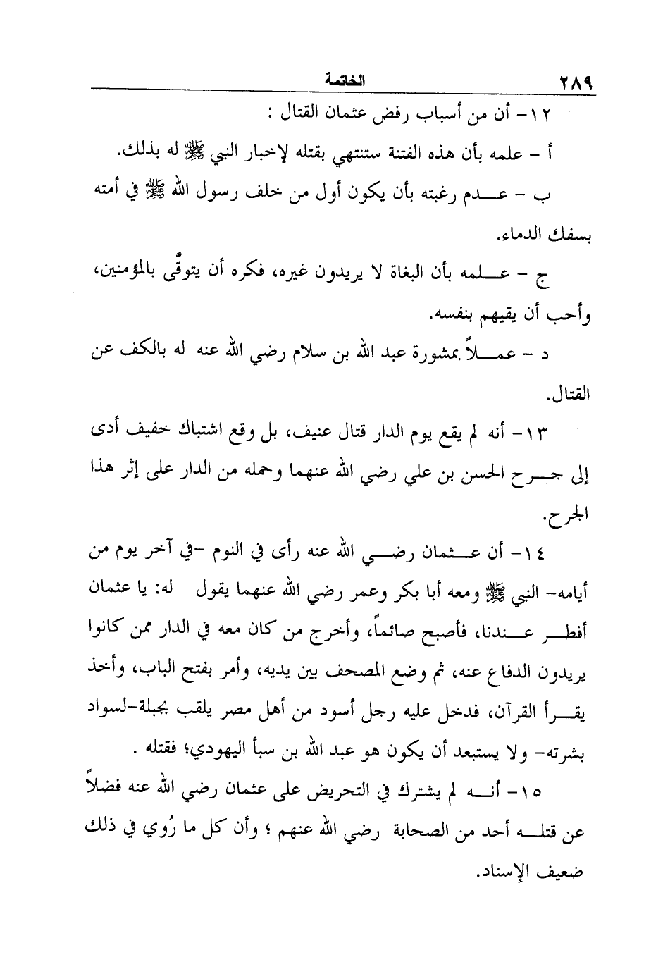 15- أنه لم يشترك في التحريض على عثمان رضي الله عنه فضلاً عن قتله أحد من الصحابة رضي الله عنهم؛ وأن كل ما رُوي في ذلك ضعيف الإسناد.