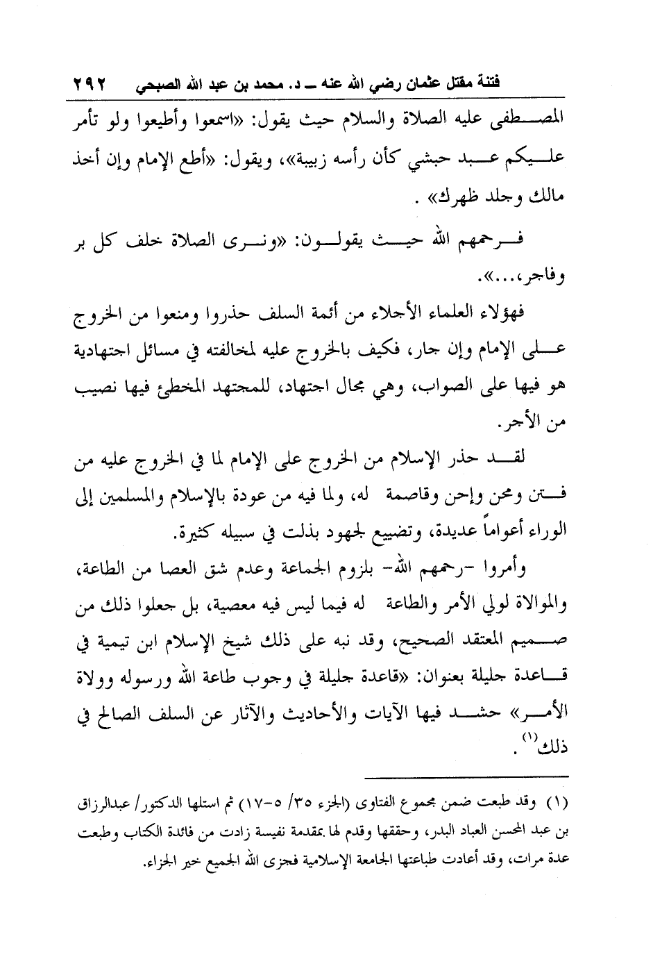وأمروا -رحمهم الله- بلزوم الجماعة وعدم شق العصا من الطاعة، والموالاة لولي الأمر والطاعة له فيما ليس فيه معصية، بل جعلوا ذلك من صميم المعتقد الصحيح، وقد نبه على ذلك شيخ الإسلام ابن تيمية في قاعدة جليلة بعنوان: "قاعدة جليلة في وجوب طاعة الله ورسوله وولاة الأمر" حشد فيها الآيات والأحاديث والآثار عن السلف الصالح في ذلك1.