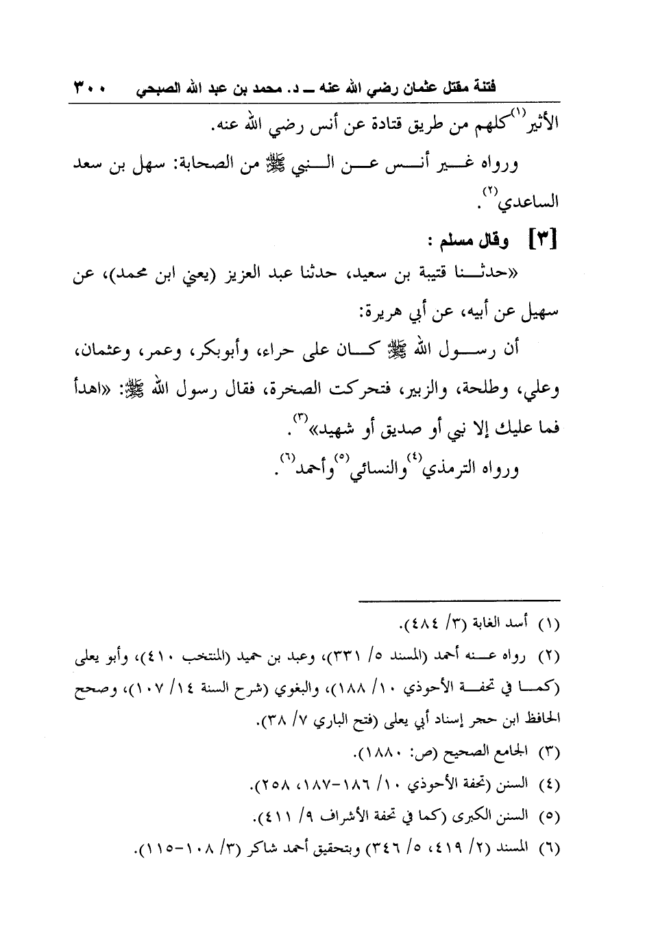 3- وقال مسلم: حدثنا قتيبة بن سعيد، حدثنا عبد العزيز (يعني ابن محمد) ، عن سهيل عن أبيه، عن أبي هريرة: أن رسول الله صلى الله عليه وسلم كان على حراء، وأبوبكر، وعمر، وعثمان، وعلي، وطلحة، والزبير، فتحركت الصخرة، فقال رسول الله صلى الله عليه وسلم: " اهدأ فما عليك إلا نبي أو صديق أو شهيد" 3.