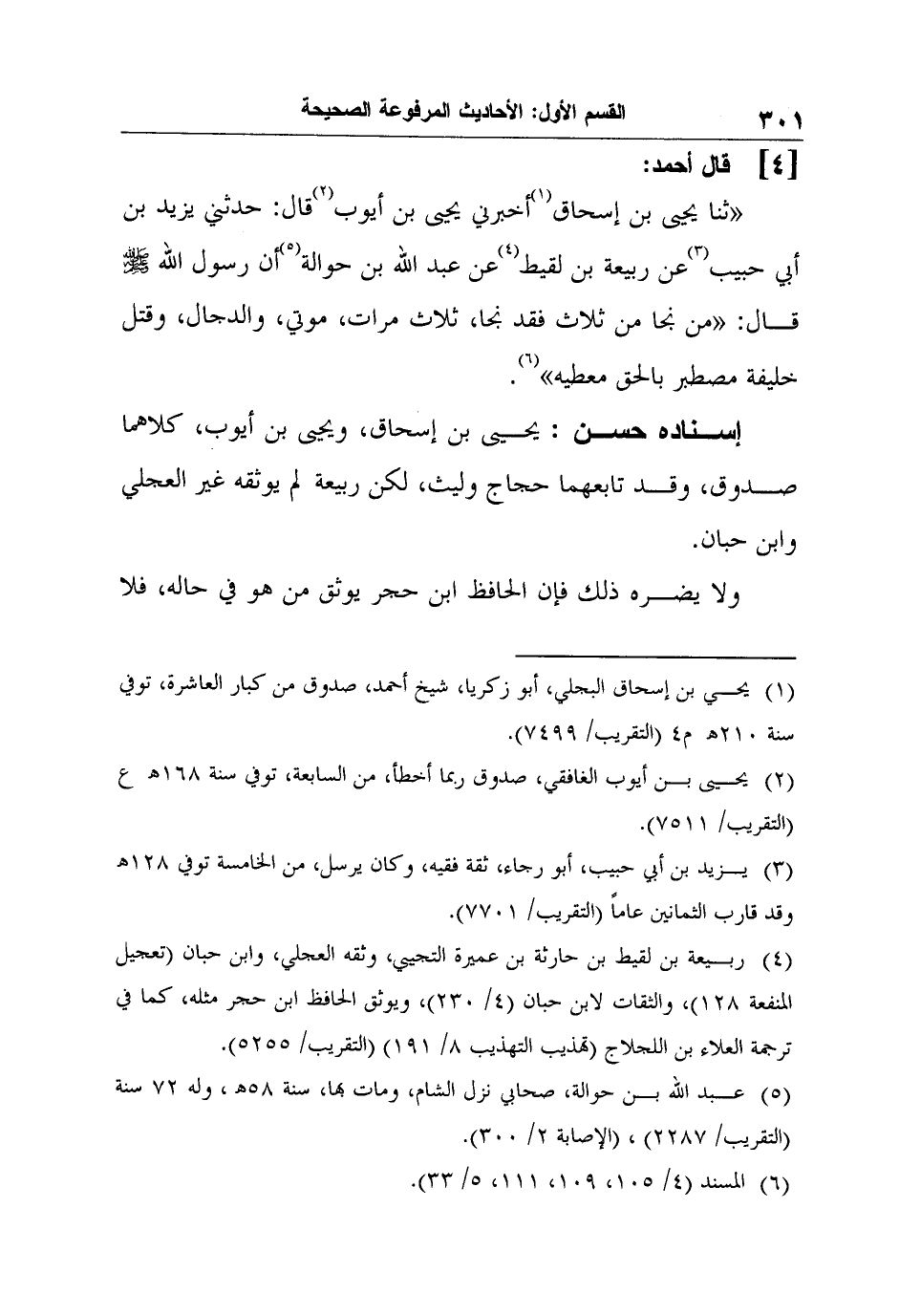 4- قال أحمد: ثنا يحيى بن إسحاق1 أخبرني يحيى بن أيوب2 قال: حدثني يزيد بن أبي حبيب3 عن ربيعة بن لقيط4 عن عبد الله بن حوالة5 أن رسول الله صلى الله عليه وسلم قال: "من نجا من ثلاث فقد نجا، ثلاث مرات، موتي، والدجال، وقتل خليفة مصطبر بالحق معطيه" 6.