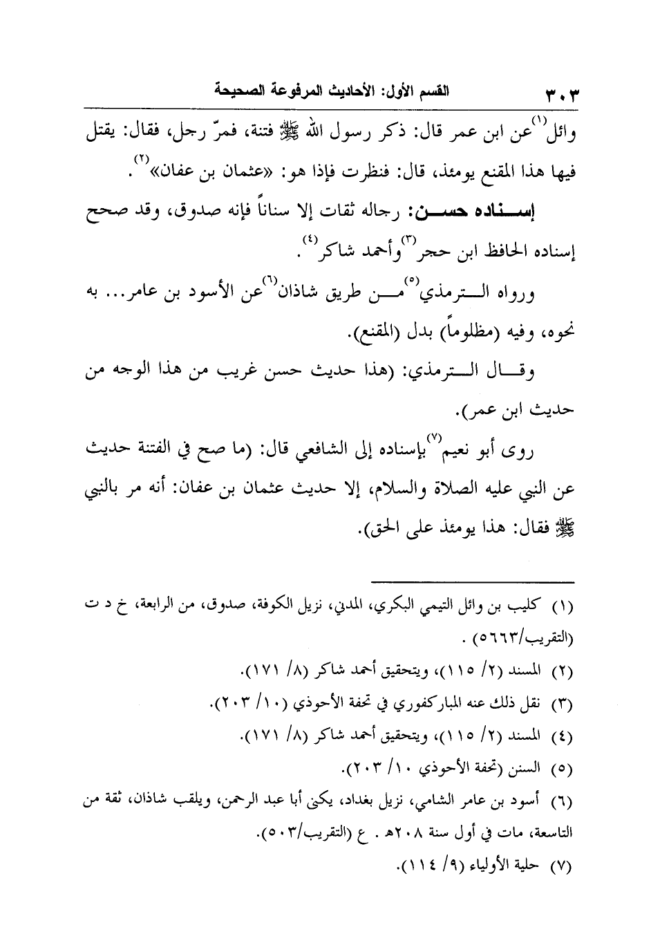 روى أبو نعيم7 بإسناده إلى الشافعي قال: "ما صح في الفتنة حديث عن النبي عليه الصلاة والسلام، إلا حديث عثمان بن عفان: أنه مر بالنبي صلى الله عليه وسلم فقال: هذا يومئذ على الحق".