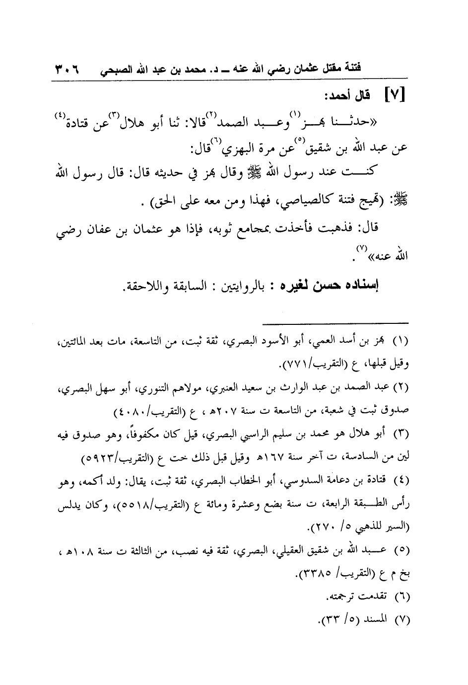 7- قال أحمد: "حدثنا بهز1 وعبد الصمد2 قالا: ثنا أبو هلال3 عن قتادة4 عن عبد الله بن شقيق5 عن مرة البهزي6 قال: كنت عند رسول الله صلى الله عليه وسلم وقال بهز في حديثه قال: قال رسول الله صلى الله عليه وسلم: "تهيج فتنة كالصياصي، فهذا ومن معه على الحق, قال: فذهبت فأخذت بمجامع ثوبه، فإذا هو عثمان بن عفان رضي الله عنه" 7.