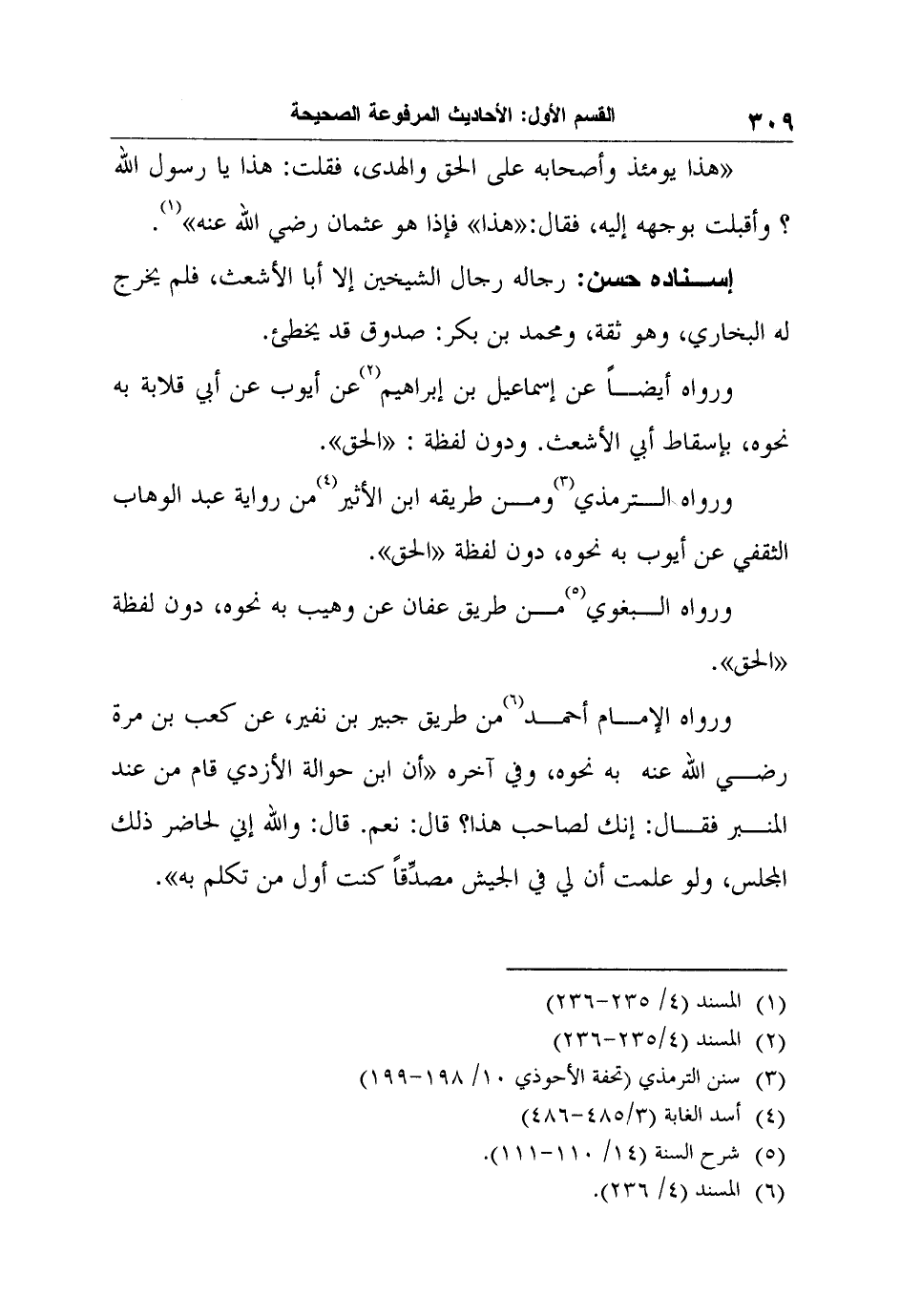 ورواه الإمام أحمد6 من طريق جبير بن نفير، عن كعب بن مرة رضي الله عنه به نحوه، وفي آخره "أن ابن حوالة الأزدي قام من عند المنبر فقال: إنك لصاحب هذا؟ قال: نعم. قال: والله إني لحاضر ذلك المجلس، ولو علمت أن لي في الجيش مصدِّقاً كنت أول من تكلم به".