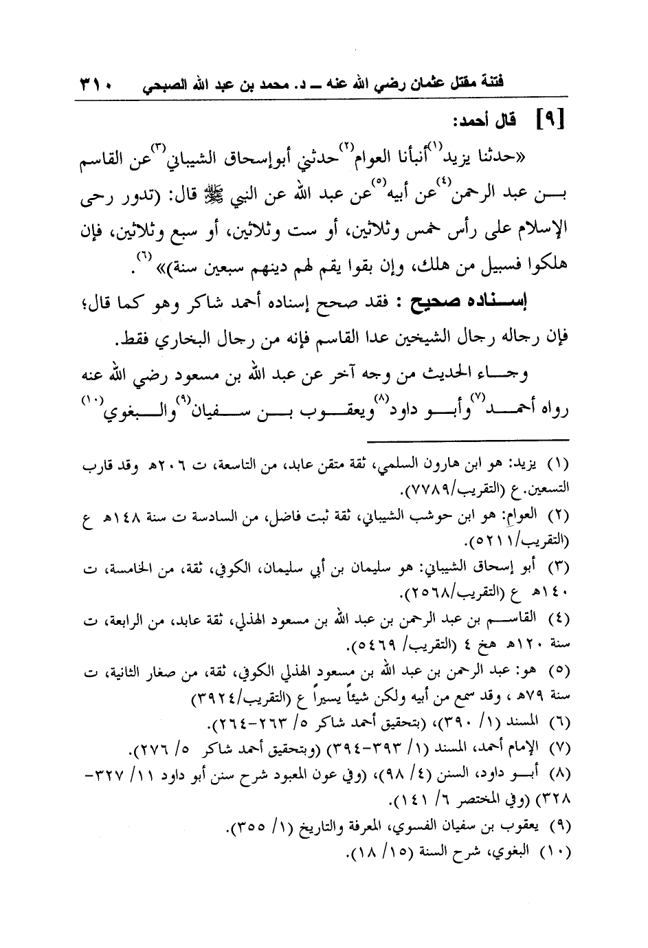 9- قال أحمد: "حدثنا يزيد1 أنبأنا العوام2 حدثني أبوإسحاق الشيباني3 عن القاسم بن عبد الرحمن4 عن أبيه5 عن عبد الله عن النبي صلى الله عليه وسلم قال: "تدور رحى الإسلام على رأس خمس وثلاثين، أو ست وثلاثين، أو سبع وثلاثين، فإن هلكوا فسبيل من هلك، وإن بقوا يقم لهم دينهم سبعين سنة" 6.