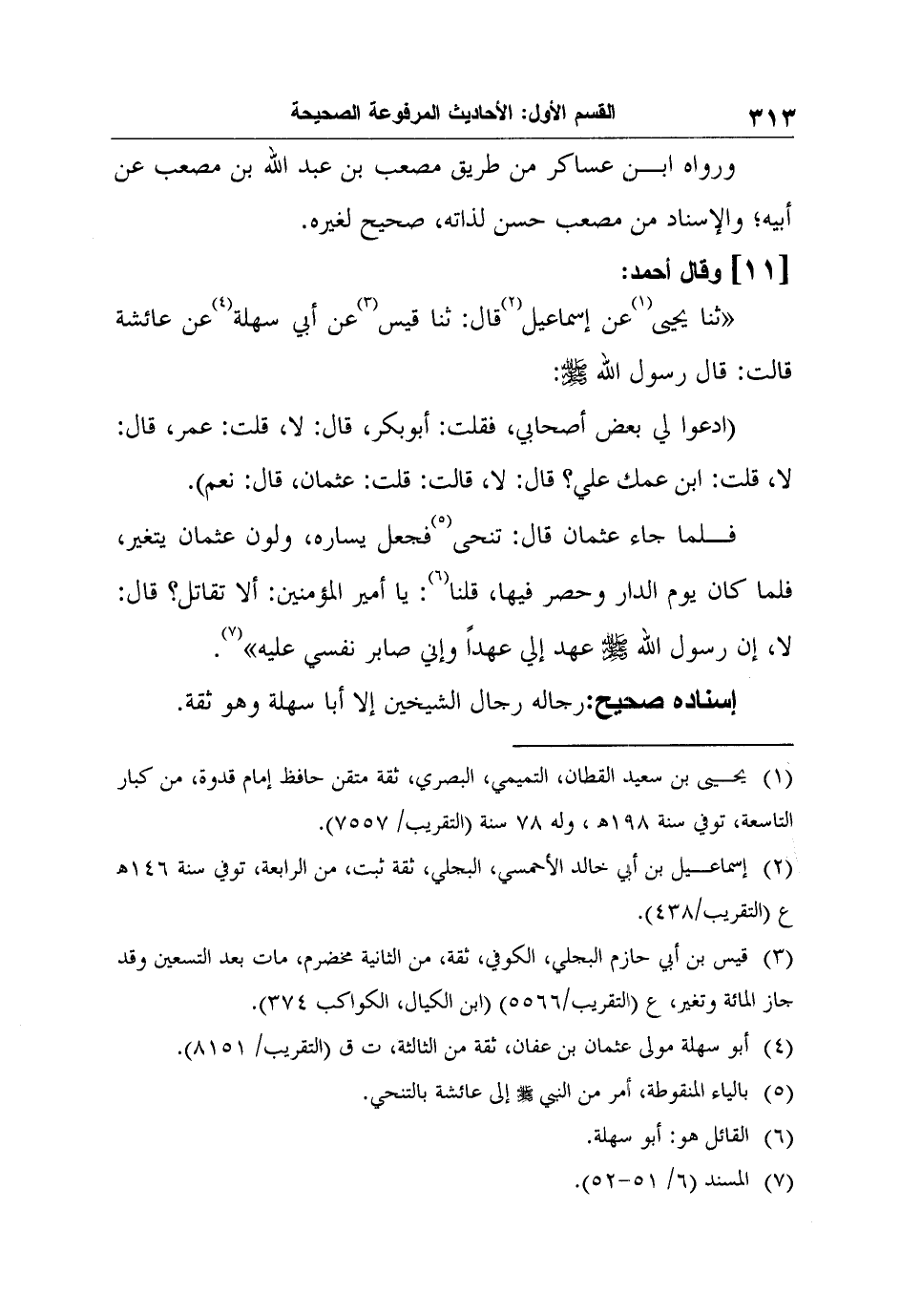 11- وقال أحمد: "ثنا يحيى1 عن إسماعيل2 قال: ثنا قيس3 عن أبي سهلة4 عن عائشة قالت: قال رسول الله صلى الله عليه وسلم: "ادعوا لي بعض أصحابي، فقلت: أبوبكر، قال: لا، قلت: عمر، قال: لا، قلت: ابن عمك علي؟ قال: لا، قالت: قلت: عثمان، قال: نعم, فلما جاء عثمان قال: تنحى5 فجعل يساره، ولون عثمان يتغير، فلما كان يوم الدار وحصر فيها، قلنا6: يا أمير المؤمنين: ألا تقاتل؟ قال: لا، إن رسول الله صلى الله عليه وسلم عهد إلي عهداً وإني صابر نفسي عليه" 7.
