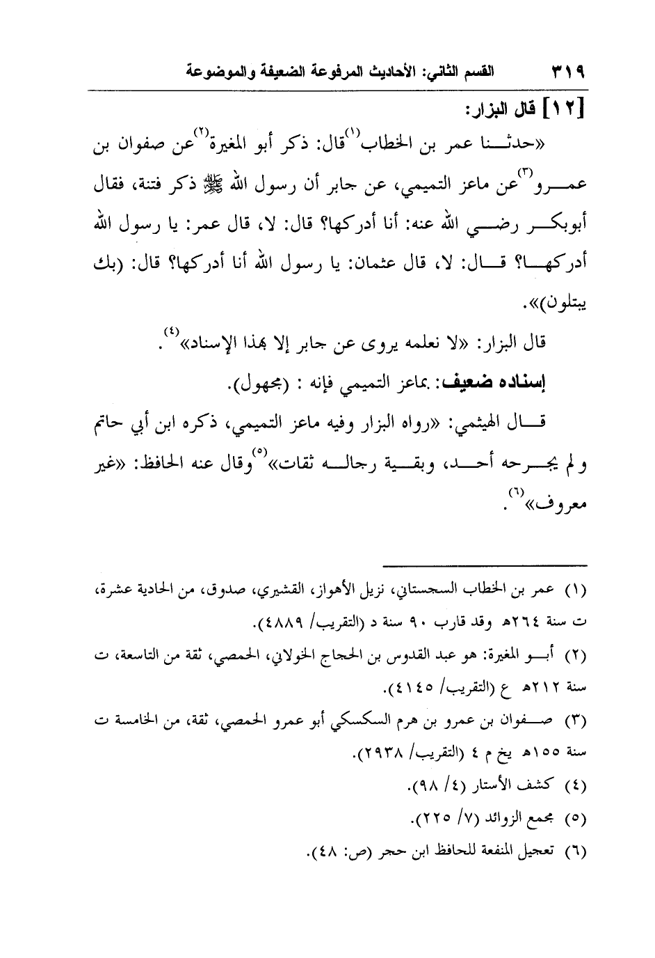 1- قال البزار: حدثنا عمر بن الخطاب1 قال: ذكر أبو المغيرة2 عن صفوان بن عمرو3 عن ماعز التميمي، عن جابر أن رسول الله صلى الله عليه وسلم ذكر فتنة، فقال أبوبكر رضي الله عنه: أنا أدركها؟ قال: لا، قال عمر: يا رسول الله أدركها؟ قال: لا، قال عثمان: يا رسول الله أنا أدركها؟ قال: بك يبتلون".