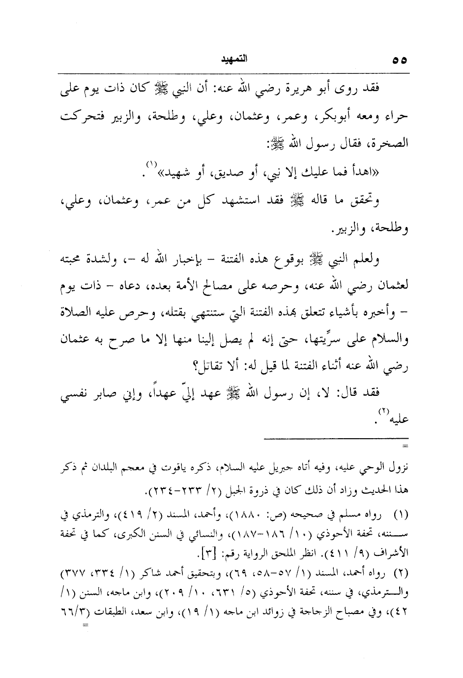 2 رواه أحمد، المسند (1/ 57-58، 69) ، وبتحقيق أحمد شاكر (1/ 334، 377) والترمذي، في سننه، تحفة الأحوذي (5/ 631، 10/ 209) ، وابن ماجه، السنن (1/42) ، وفي مصباح الزجاجة في زوائد ابن ماجه (1/ 19) وابن سعد، الطبقات (3/66-67) ، وابن أبي شيبة، المصنف (15/202) ، والحميدي، المسند (1/ 130) ، وابن حبان في صحيحه (الاحسان في ترتيب صحيح ابن حبان9/35) ، وأبو نعيم، حلية الأولياء (1/ 58) ، وابن عساكر، تاريخ دمشق، ترجمة عثمان (283- 285) ، وذكره المحب الطبري، الرياض النضرة (3/ 59) , كلهم من طريق عائشة رضي الله عنها، وصححه الكتاني وأحمد شاكر والألباني. انظر الملحق الرواية رقم: [11] .