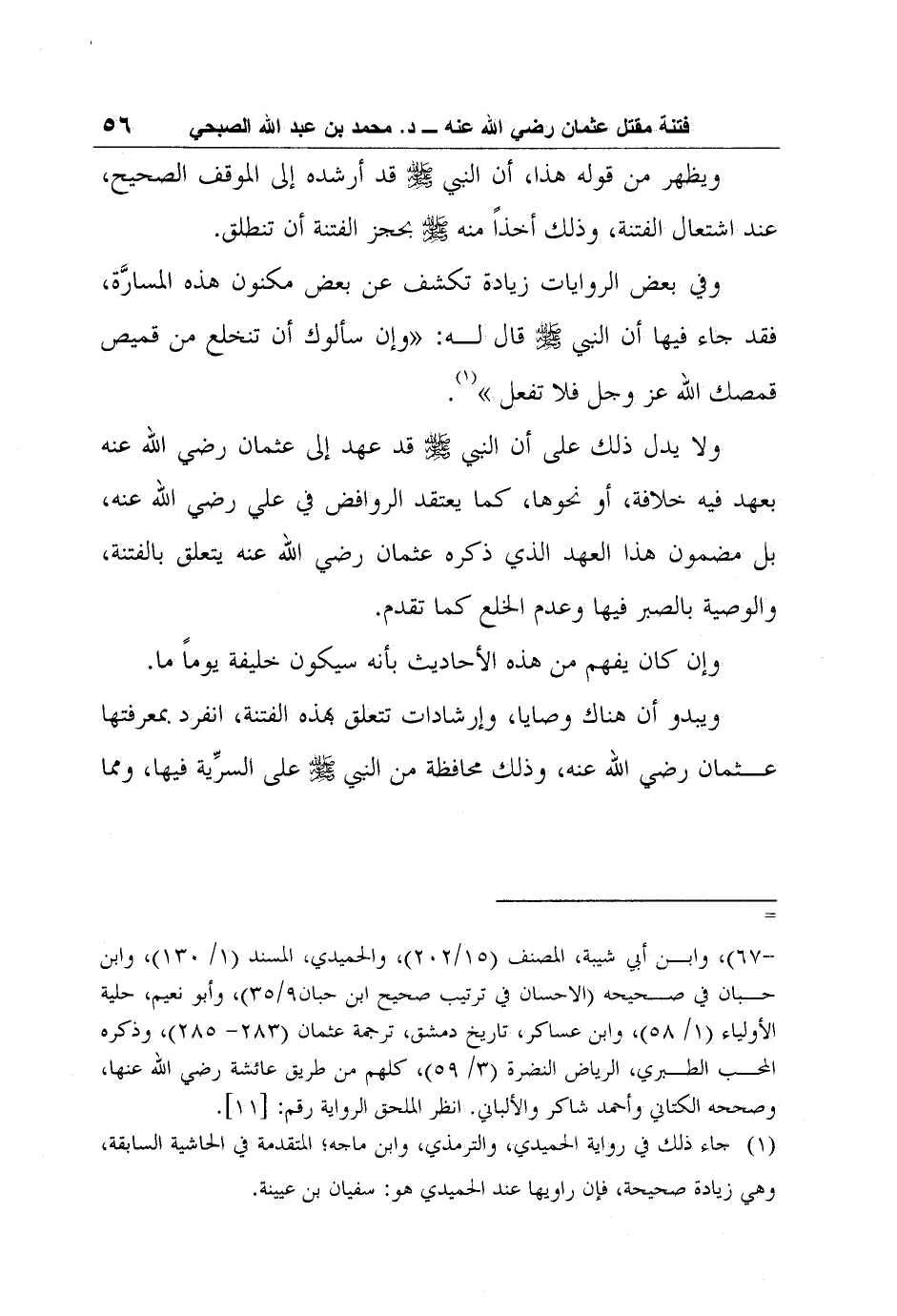 ولا يدل ذلك على أن النبي صلى الله عليه وسلم قد عهد إلى عثمان رضي الله عنه بعهد فيه خلافة، أو نحوها، كما يعتقد الروافض في علي رضي الله عنه، بل مضمون هذا العهد الذي ذكره عثمان رضي الله عنه يتعلق بالفتنة، والوصية بالصبر فيها وعدم الخلع كما تقدم.
