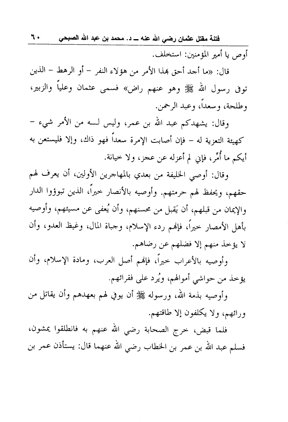 قال: "ما أجد أحق بهذا الأمر من هؤلاء النفر - أو الرهط - الذين توفى رسول الله صلى الله عليه وسلم وهو عنهم راض" فسمى عثمان وعلياً والزبير، وطلحة، وسعداً، وعبد الرحمن.