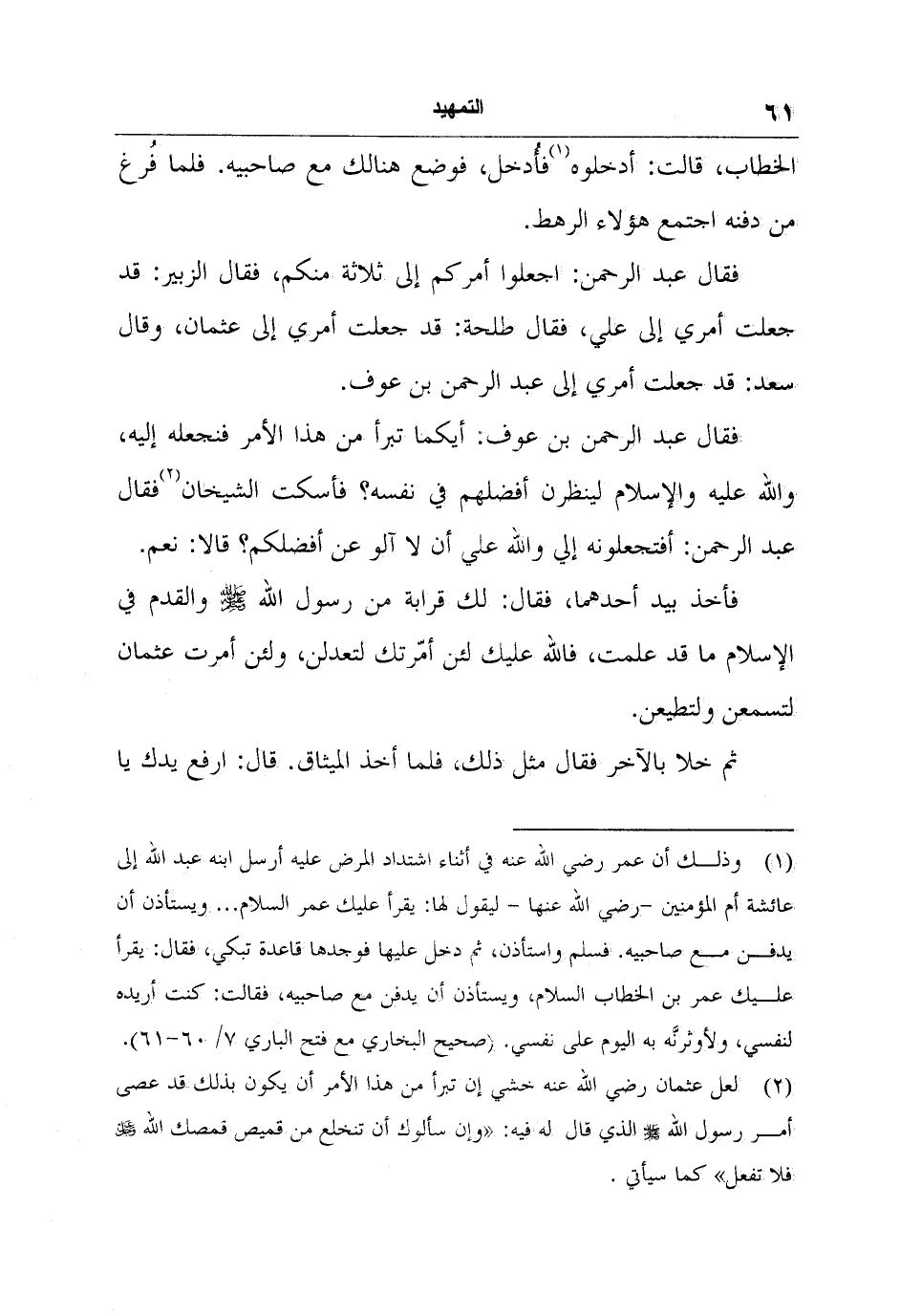 2 لعل عثمان رضي الله عنه خشي إن تبرأ من هذا الأمر أن يكون بذلك قد عصى أمر رسول الله صلى الله عليه وسلم الذي قال له فيه: "وإن سألوك أن تنخلع من قميص قمصك الله عزوجل فلا تفعل" كما سيأتي.