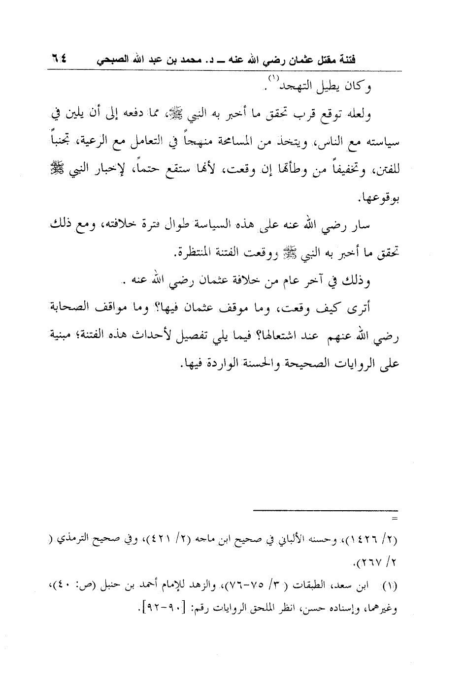 ولعله توقع قرب تحقق ما أخبر به النبي صلى الله عليه وسلم، مما دفعه إلى أن يلين في سياسته مع الناس، ويتخذ من المسامحة منهجاً في التعامل مع الرعية، تجنباً للفتن، وتخفيفاً من وطأتها إن وقعت، لأنها ستقع حتماً، لإخبار النبي صلى الله عليه وسلم بوقوعها.