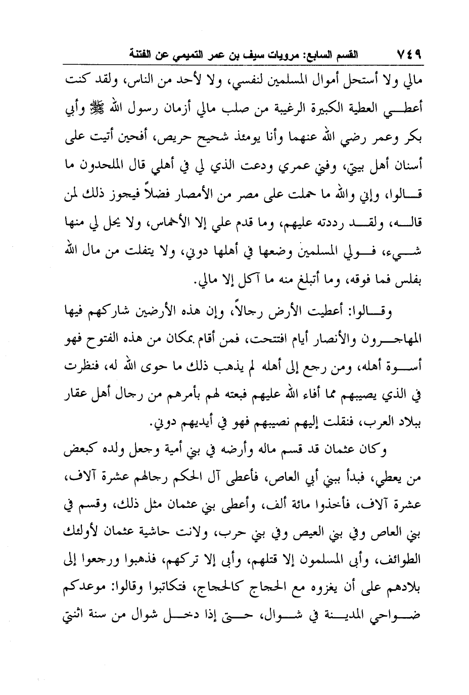 مالي ولا أستحل أموال المسلمين لنفسي، ولا لأحد من الناس، ولقد كنت أعطي العطية الكبيرة الرغيبة من صلب مالي أزمان رسول الله صلى الله عليه وسلم وأبي بكر وعمر رضي الله عنهما وأنا يومئذ شحيح حريص، أفحين أتيت على أسنان أهل بيتي، وفني عمري ودعت الذي لي في أهلي قال الملحدون ما قالوا، وإني والله ما حملت على مصر من الأمصار فضلاً فيجوز ذلك لمن قاله، ولقد رددته عليهم، وما قدم علي إلا الأخماس، ولا يحل لي منها شيء، فولي المسلمين وضعها في أهلها دوني، ولا يتفلت من مال الله بفلس فما فوقه، وما أتبلغ منه ما آكل إلا مالي.
