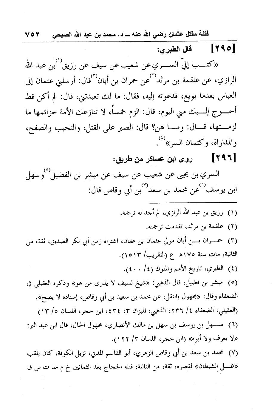 6 مبشر بن فضيل، قال الذهبي: "شيخ لسيف لا يدرى من هو" وذكره العقيلي في الضعفاء وقال: "مجهول بالنقل، عن محمد بن سعيد بن أبي وقاص، إسناده لا يصح".