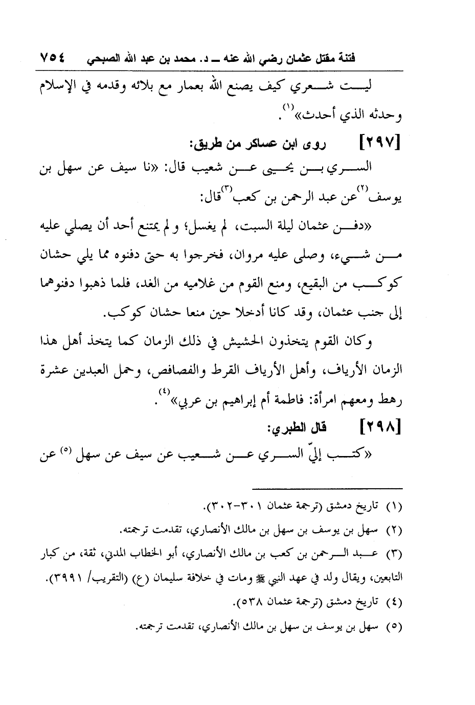 30- روى ابن عساكر من طريق: السري بن يحيى عن شعيب قال: "نا سيف عن سهل بن يوسف2 عن عبد الرحمن بن كعب3 قال: "دفن عثمان ليلة السبت، لم يغسل؛ ولم يمتنع أحد أن يصلي عليه من شيء، وصلى عليه مروان، فخرجوا به حتى دفنوه مما يلي حشان كوكب من البقيع، ومنع القوم من غلاميه من الغد، فلما ذهبوا دفنوهما إلى جنب عثمان، وقد كانا أدخلا حين منعا حشان كوكب.