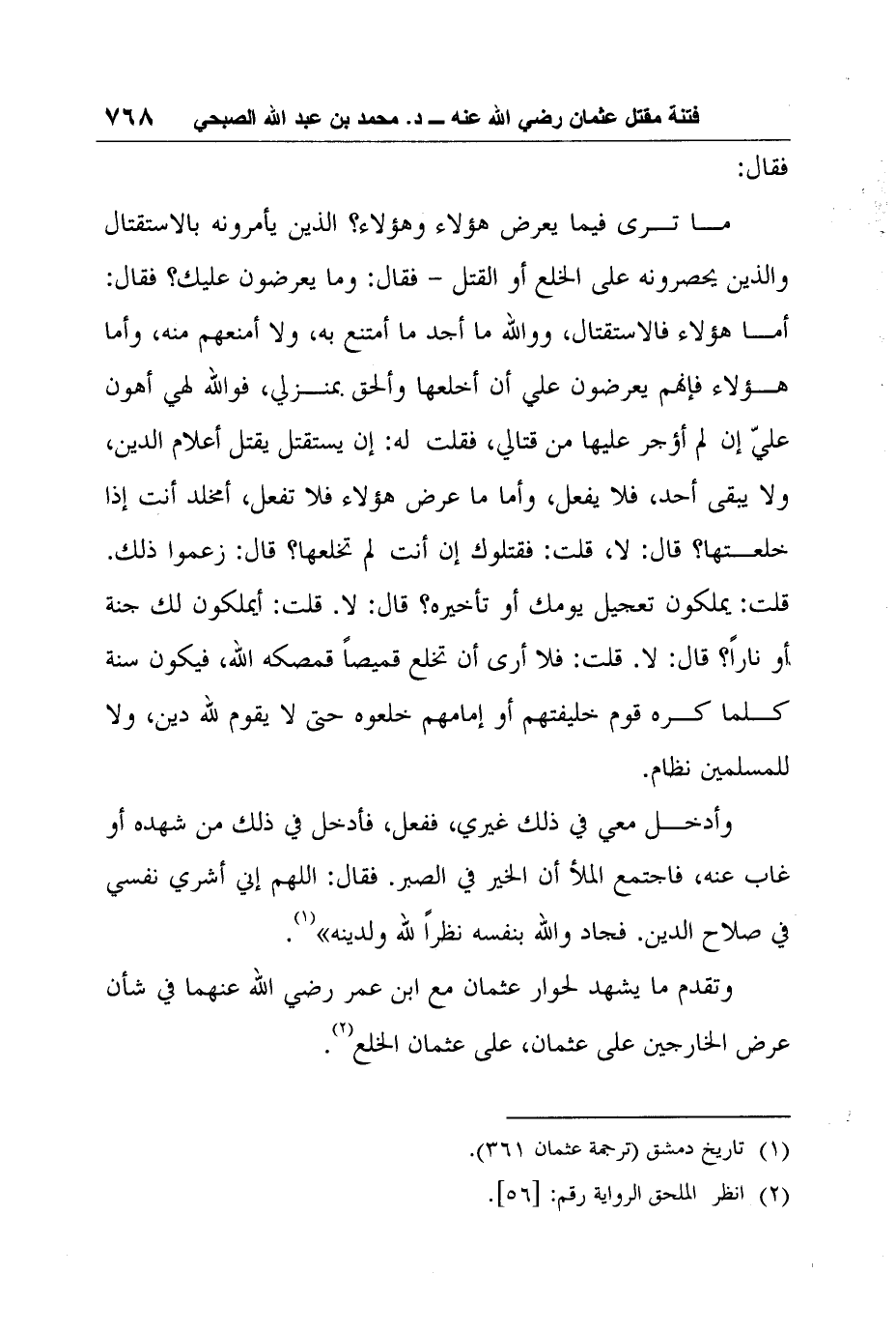 وتقدم ما يشهد لحوار عثمان مع ابن عمر رضي الله عنهما في شأن عرض الخارجين على عثمان، على عثمان الخلع2