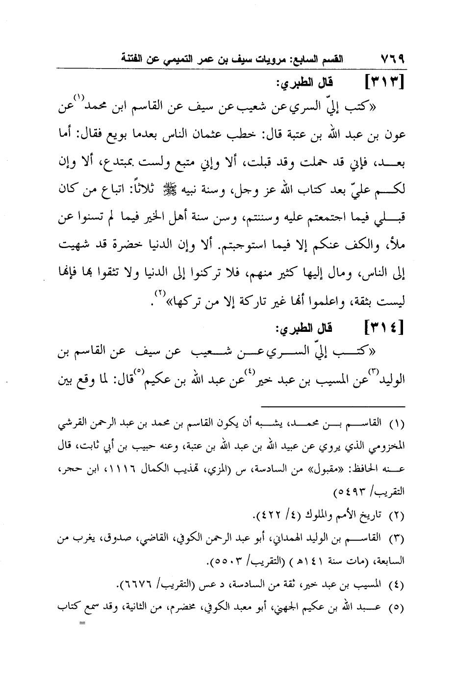 46- قال الطبري: "كتب إليّ السري1 عن شعيب2 عن سيف عن القاسم ابن محمد3 عن عون بن عبد الله بن عتبة قال: خطب عثمان الناس بعدما بويع فقال: