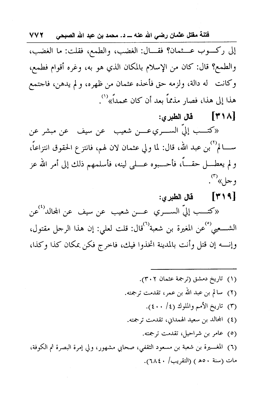 52- قال الطبري: "كتب إليّ السري عن شعيب عن سيف عن المجالد4 عن الشعبي5 عن المغيرة بن شعبة6 قال: قلت لعلي: إن هذا الرجل مقتول، وإنه إن قتل وأنت بالمدينة اتخذوا فيك، فاخرج فكن بمكان كذا وكذا،