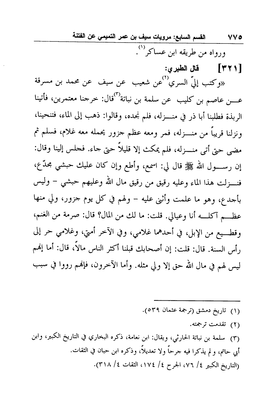 54- قال الطبري: "وكتب إليّ السري2 عن شعيب عن سيف عن محمد بن مسرقة عن عاصم بن كليب عن سلمة بن نباتة3 قال: خرجنا معتمرين، فأتينا الربذة فطلبنا أبا ذر في منزله، فلم نجده، وقالوا: ذهب إلى الماء، فتنحينا، ونزلنا قريباً من منزله، فمر ومعه عظم جزور يحمله معه غلام، فسلم ثم مضى حتى أتى منزله، فلم يمكث إلا قليلاً حتى جاء. فجلس إلينا وقال: إن رسول الله صلى الله عليه وسلم قال لي: اسمع، وأطع وإن كان عليك حبشي مجدّع، فنزلت هذا الماء وعليه رقيق من رقيق مال الله وعليهم حبشي - وليس بأجدع، وهو ما علمت وأثنى عليه - ولهم في كل يوم جزور، ولي منها عظم آكله أنا وعيالي. قلت: ما لك من المال؟ قال: صرمة من الغنم، وقطيع من الإبل، في أحدهما غلامي، وفي الآخر أمتي، وغلامي حر إلى رأس السنة. قال: قلت: إن أصحابك قبلنا أكثر الناس مالاً، قال: أما إنهم ليس لهم في مال الله حق إلا ولي مثله. وأما الآخرون، فإنهم رووا في سبب