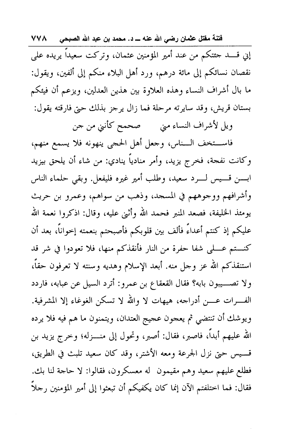 إني قد جئتكم من عند أمير المؤمنين عثمان، وتركت سعيداً يريده على نقصان نسائكم إلى مائة درهم، ورد أهل البلاء منكم إلى ألفين، ويقول: ما بال أشراف النساء وهذه العلاوة بين هذين العدلين، ويزعم أن فيئكم بستان قريش، وقد سايرته مرحلة فما زال يرجز بذلك حتى فارقته يقول: