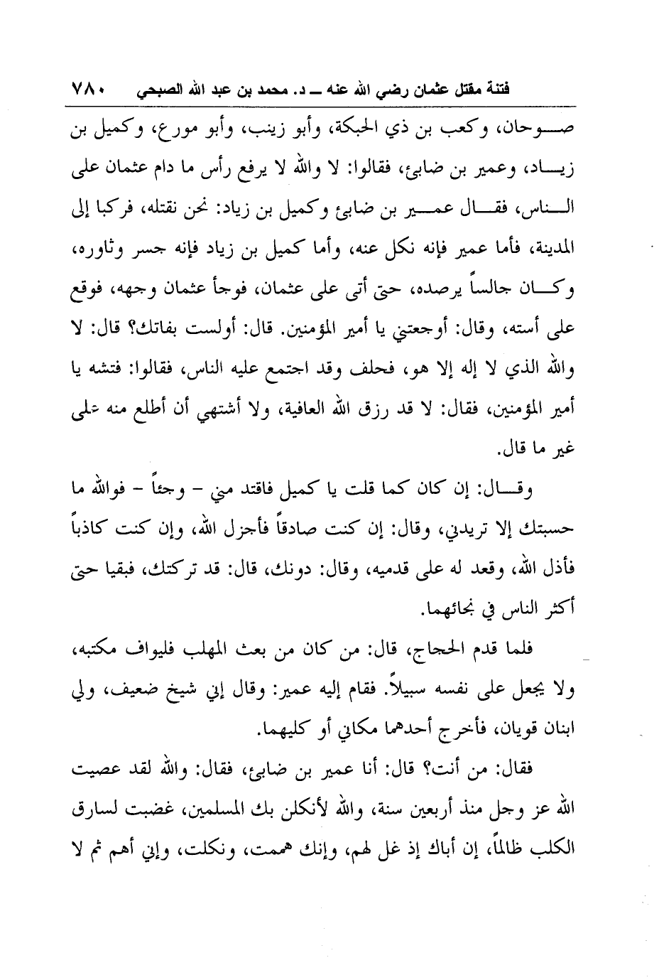 صوحان، وكعب بن ذي الحبكة، وأبو زينب، وأبو مورع، وكميل بن زياد، وعمير بن ضابئ، فقالوا: لا والله لا يرفع رأس ما دام عثمان على الناس، فقال عمير بن ضابئ وكميل بن زياد: نحن نقتله، فركبا إلى المدينة، فأما عمير فإنه نكل عنه، وأما كميل بن زياد فإنه جسر وثاوره، وكان جالساً يرصده، حتى أتى على عثمان، فوجأ عثمان وجهه، فوقع على أسته، وقال: أوجعتني يا أمير المؤمنين. قال: أولست بفاتك؟ قال: لا والله الذي لا إله إلا هو، فحلف وقد اجتمع عليه الناس، فقالوا: فتشه يا أمير المؤمنين، فقال: لا قد رزق الله العافية، ولا أشتهي أن أطلع منه على غير ما قال. وقال: إن كان كما قلت يا كميل فاقتد مني - وجئاً - فوالله ما حسبتك إلا تريدني، وقال: إن كنت صادقاً فأجزل الله، وإن كنت كاذباً فأذل الله، وقعد له على قدميه، وقال: دونك، قال: قد تركتك، فبقيا حتى أكثر الناس في نجائهما.
