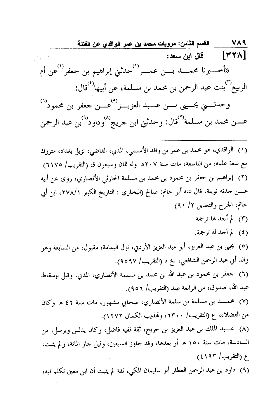 1- قال ابن سعد: "أخبرنا محمد بن عمر1 حدثني إبراهيم بن جعفر2 عن أم الربيع3 بنت عبد الرحمن بن محمد بن مسلمة، عن أبيها4 قال: وحدثني يحيى بن عبد العزيز5 عن جعفر بن محمود6 عن محمد بن مسلمة7 قال: وحدثني ابن جريج8 وداود9 بن عبد الرحمن