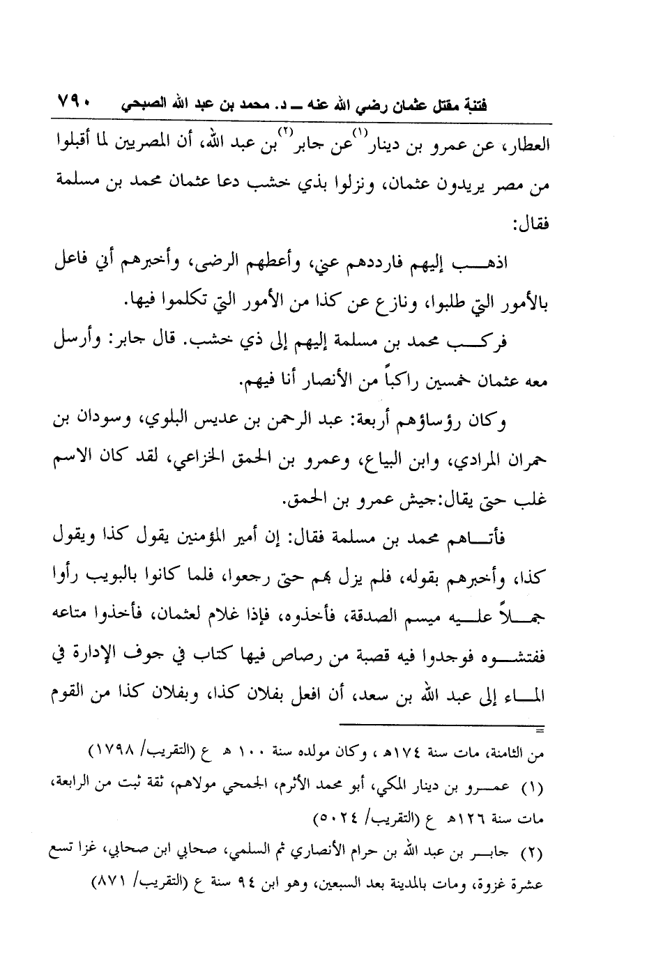 العطار، عن عمرو بن دينار1 عن جابر2 بن عبد الله، أن المصريين لما أقبلوا من مصر يريدون عثمان، ونزلوا بذي خشب دعا عثمان محمد بن مسلمة فقال: اذهب إليهم فارددهم عني، وأعطهم الرضى، وأخبرهم أني فاعل بالأمور التي طلبوا، ونازع عن كذا من الأمور التي تكلموا فيها. فركب محمد بن مسلمة إليهم إلى ذي خشب. قال جابر: وأرسل معه عثمان خمسين راكباً من الأنصار أنا فيهم.