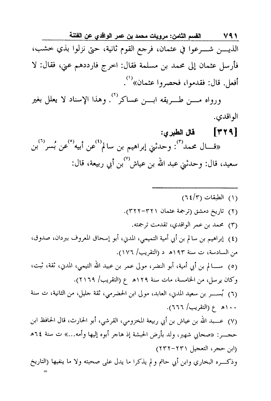 2- قال الطبري: قال محمد3: وحدثني إبراهيم بن سالم4 عن أبيه5 عن بُسر6 ابن سعيد، قال: وحدثني عبد الله بن عياش7 بن أبي ربيعة، قال: