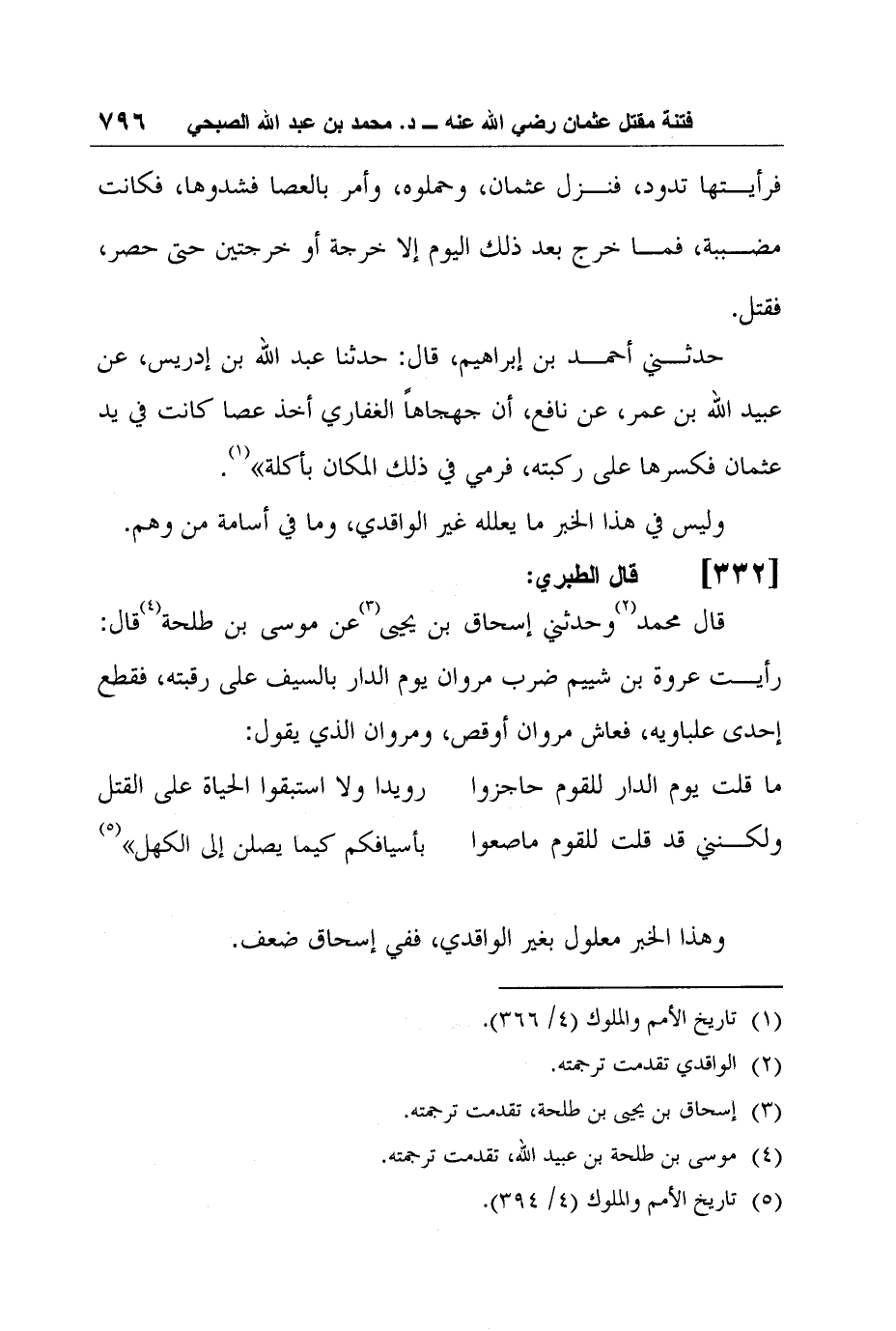 5- قال الطبري: قال محمد2 وحدثني إسحاق بن يحيى3 عن موسى بن طلحة4 قال: رأيت عروة بن شييم ضرب مروان يوم الدار بالسيف على رقبته، فقطع إحدى علباويه، فعاش مروان أوقص، ومروان الذي يقول: