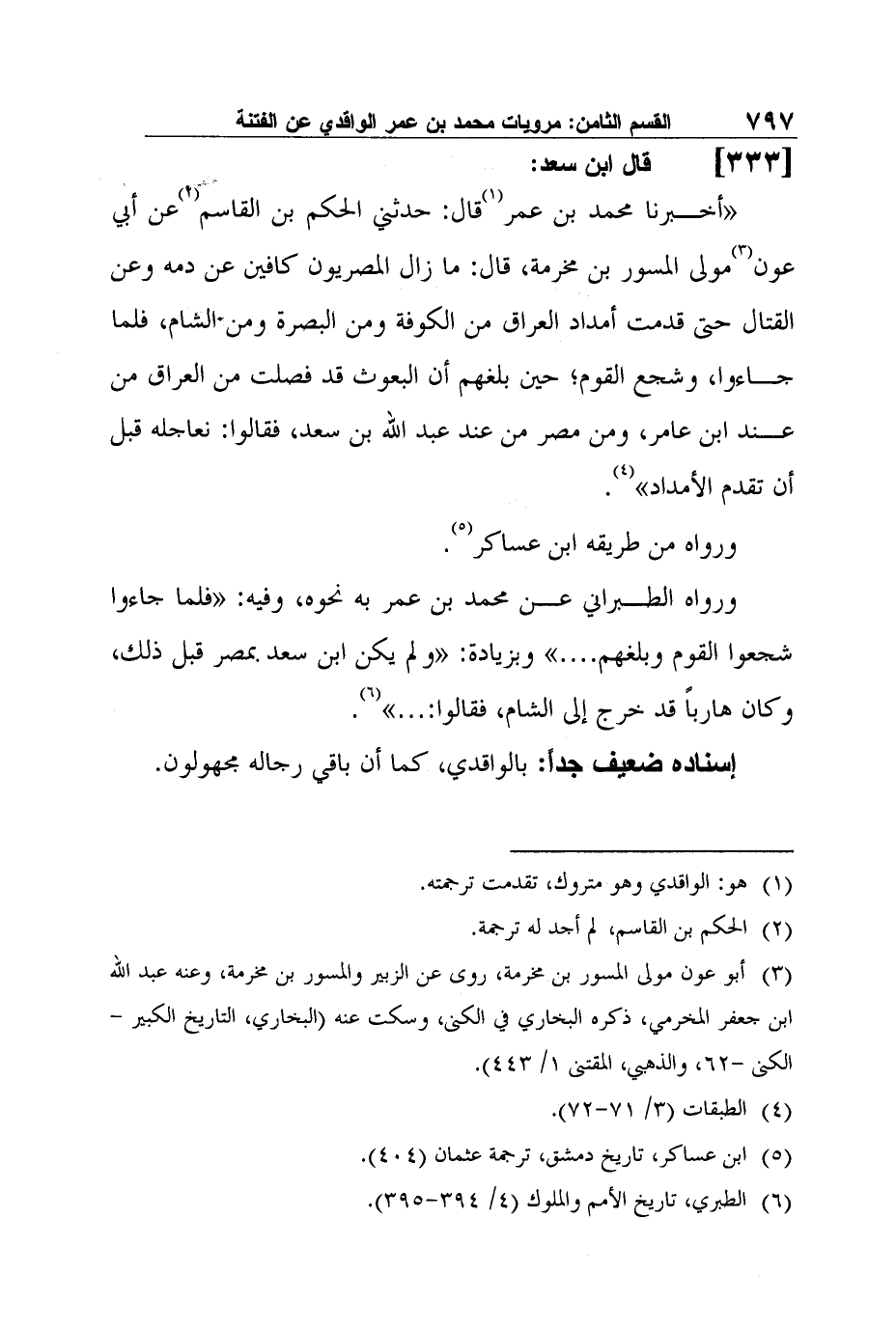 6- قال ابن سعد: أخبرنا محمد بن عمر1 قال: حدثني الحكم بن القاسم2 عن أبي عون3 مولى المسور بن مخرمة، قال: ما زال المصريون كافين عن دمه وعن القتال حتى قدمت أمداد العراق من الكوفة ومن البصرة ومن الشام، فلما جاءوا، وشجع القوم؛ حين بلغهم أن البعوث قد فصلت من العراق من عند ابن عامر، ومن مصر من عند عبد الله بن سعد، فقالوا: نعاجله قبل أن تقدم الأمداد"4.