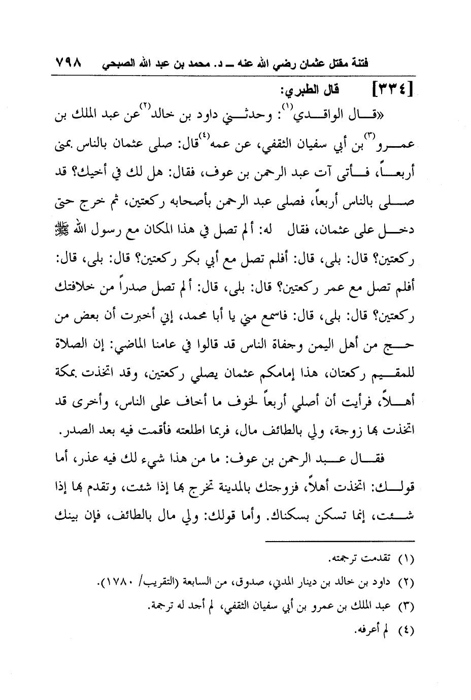 7- قال الطبري: "قال الواقدي1: وحدثني داود بن خالد2 عن عبد الملك بن عمرو3 بن أبي سفيان الثقفي، عن عمه4 قال: صلى عثمان بالناس بمنى أربعاً، فأتى آت عبد الرحمن بن عوف، فقال: هل لك في أخيك؟ قد صلى بالناس أربعاً، فصلى عبد الرحمن بأصحابه ركعتين، ثم خرج حتى دخل على عثمان، فقال له: ألم تصل في هذا المكان مع رسول الله صلى الله عليه وسلم ركعتين؟ قال: بلى، قال: أفلم تصل مع أبي بكر ركعتين؟ قال: بلى، قال: أفلم تصل مع عمر ركعتين؟ قال: بلى، قال: ألم تصل صدراً من خلافتك ركعتين؟ قال: بلى، قال: فاسمع مني يا أبا محمد، إني أخبرت أن بعض من حج من أهل اليمن وجفاة الناس قد قالوا في عامنا الماضي: إن الصلاة للمقيم ركعتان، هذا إمامكم عثمان يصلي ركعتين، وقد اتخذت بمكة أهلاً، فرأيت أن أصلي أربعاً لخوف ما أخاف على الناس، وأخرى قد اتخذت بها زوجة، ولي بالطائف مال، فربما اطلعته فأقمت فيه بعد الصدر.