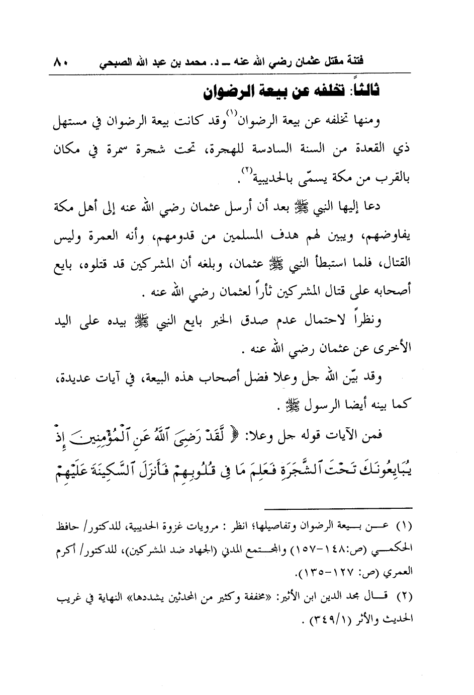 1 عن بيعة الرضوان وتفاصيلها؛ انظر: مرويات غزوة الحديبية، للدكتور/ حافظ الحكمي (ص:148-157) والمجتمع المدني (الجهاد ضد المشركين، للدكتور/ أكرم العمري (ص: 127-135) .