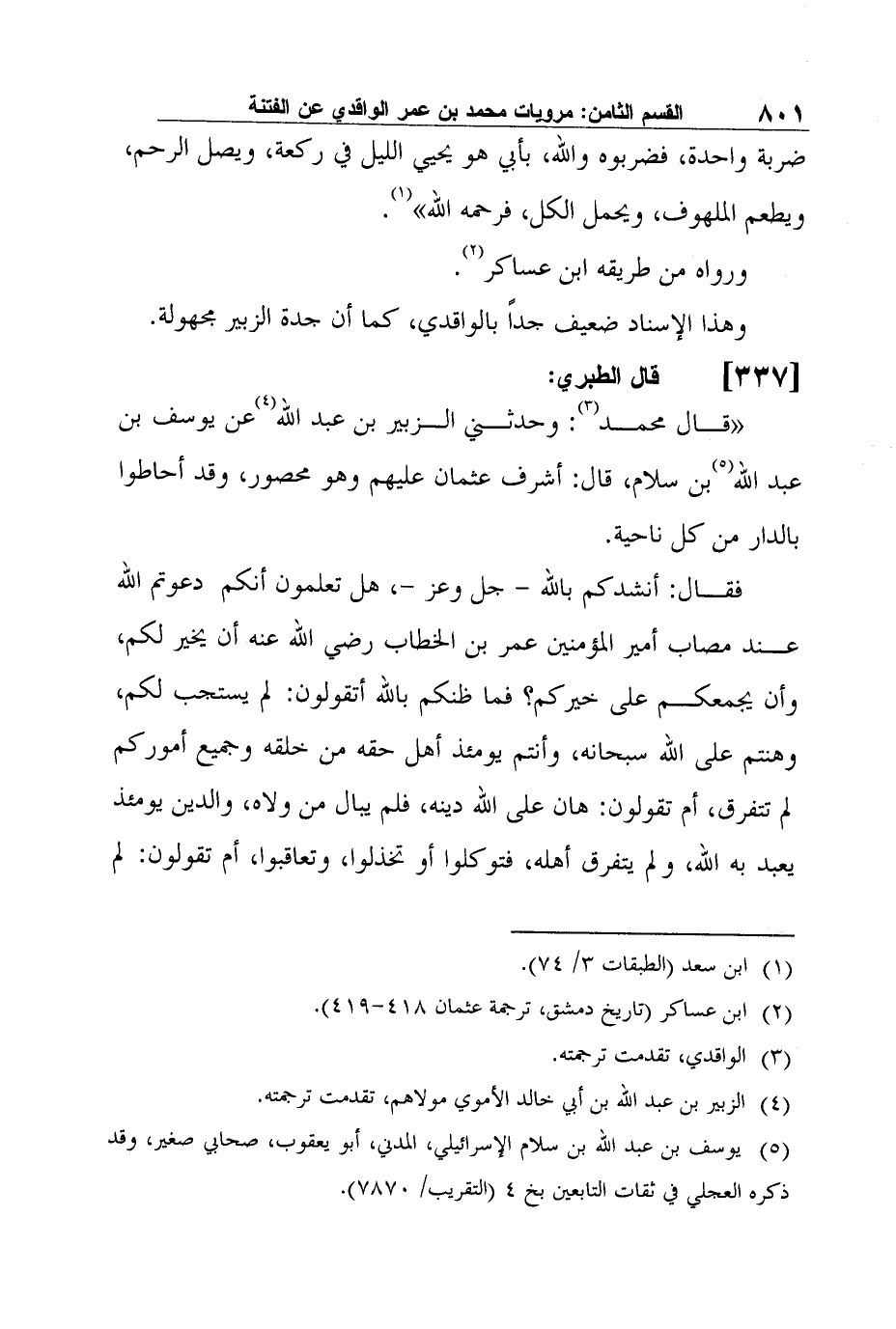 10- قال الطبري: "قال محمد3: وحدثني الزبير بن عبد الله4 عن يوسف بن عبد الله5 بن سلام، قال: أضرف عثمان عليهم وهو محصور، وقد أحاطوا بالدار من كل ناحية.