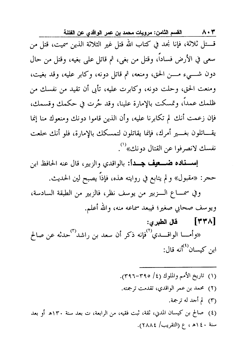 11- قال الطبري: "وأما الواقدي2 فإنه ذكر أن سعد بن راشد3 حدثه عن صالح