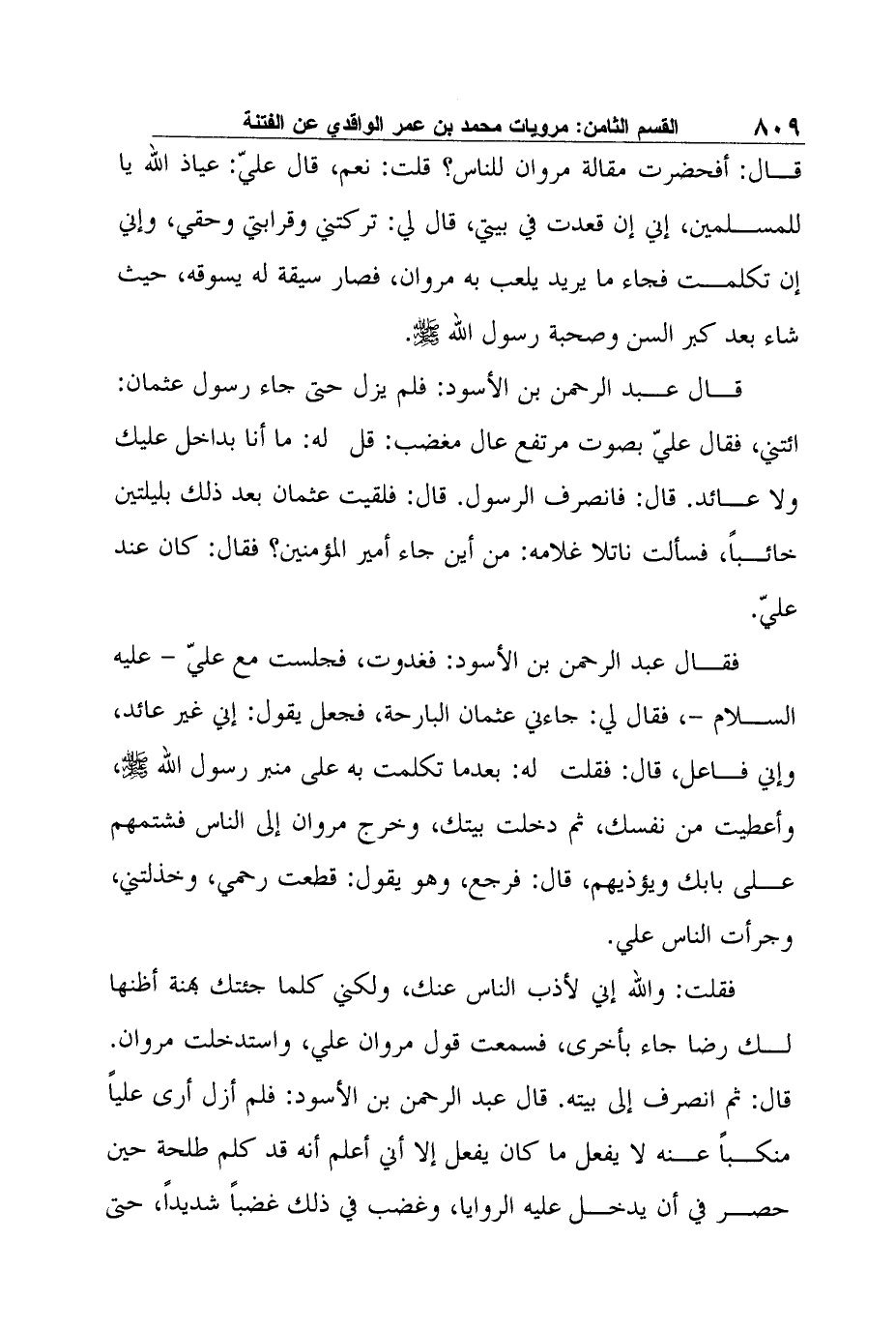 فقلت: والله إني لأذب الناس عنك، ولكني كلما جئتك بهنة أظنها لك رضا جاء بأخرى، فسمعت قول مروان علي، واستدخلت مروان. قال: ثم انصرف إلى بيته. قال عبد الرحمن بن الأسود: فلم أزل أرى علياً منكباً عنه لا يفعل ما كان يفعل إلا أني أعلم أنه قد كلم طلحة حين حصر في أن يدخل عليه الروايا، وغضب فيذلك غضباً شديداً، حتى