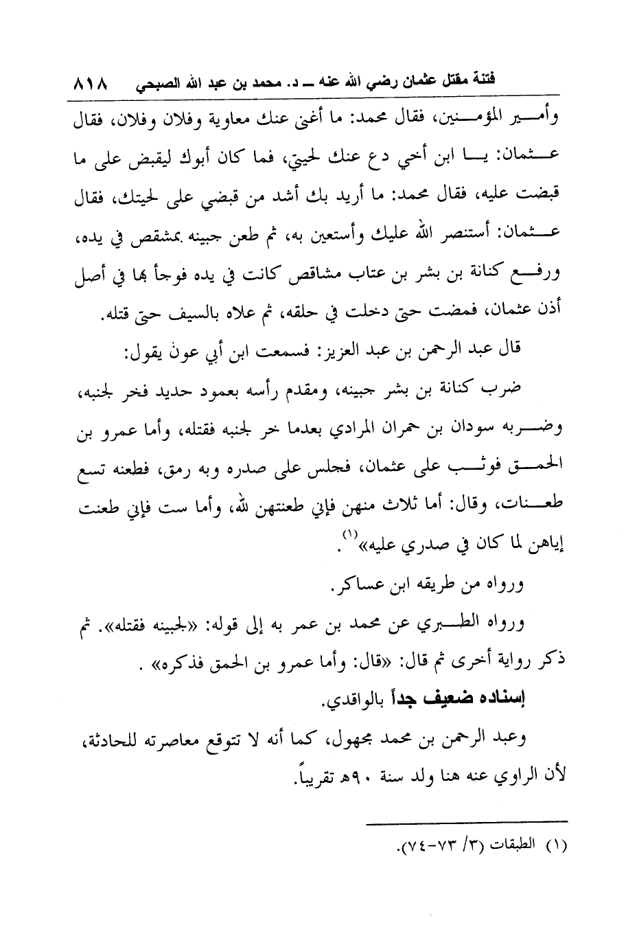 وعبد الرحمن بن محمد مجهول، كما أنه لا تتوقع معاصرته للحادثة، لأن الراوي عنه هنا ولد سنة 90? تقريباً.