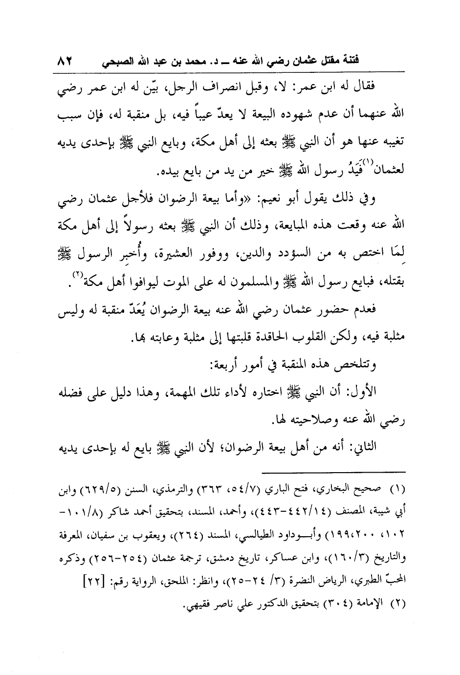 1 صحيح البخاري، فتح الباري (7/54، 363) والترمذي، السنن (5/629) وابن أبي شيبة، المصنف (14/442-443) ، وأحمد، المسند، بتحقيق أحمد شاكر (8/101-102، 199، 200) وأبوداود الطيالسي، المسند (264) ، ويعقوب بن سفيان، المعرفة والتاريخ (3/160) ، وابن عساكر، تاريخ دمشق، ترجمة عثمان (254-256) وذكره المحبّ الطبري، الرياض النضرة (3/ 24-25) وانظر: الملحق، الرواية رقم: [22]
