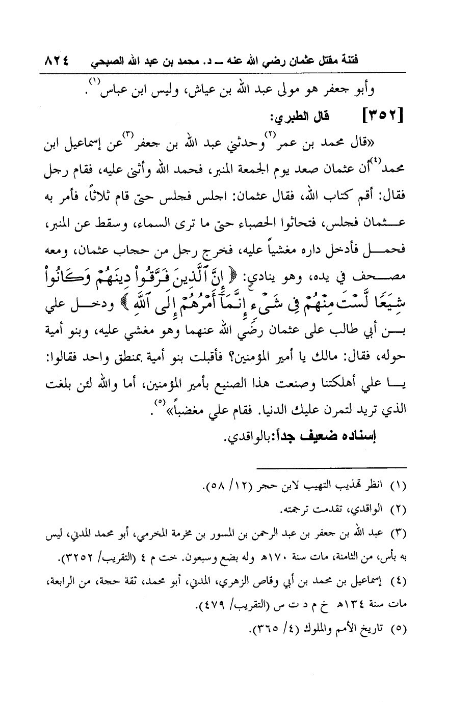 25- قال الطبري: "قال محمد بن عمر2 وحدثني عبد الله بن جعفر3 عن إسماعيل ابن محمد4 أن عثمان صعد يوم الجمعة المنبر، فحمد الله وأثنى عليه، فقام رجل فقال: أقم كتاب الله، فقال عثمان: اجلس فجلس حتى قام ثلاثاً، فأمر به عثمان فجلس، فتحاثوا الحصباء حتى ما ترى السماء، وسقط عن المنبر، فحمل فأدخل داره مغشياً عليه، فخرج رجل من حجاب عثمان، ومعه مصحف في يده، وهو ينادي: {إِنَّ الَّذِينَ فَرَّقُوا دِينَهُمْ وَكَانُوا شِيَعاً لَسْتَ مِنْهُمْ فِي شَيْءٍ إِنَّمَا أَمْرُهُمْ إِلَى اللَّهِ} ودخل علي بن أبي طالب على عثمان رضي الله عنهما وهو مغشي عليه، وبنو أمية حوله، فقال: مالك يا أمير المؤمنين؟ فأقبلت بنو أمية بمنطق واحد فقالوا: يا علي أهلكتنا وصنعت هذا الصنيع بأمير المؤمنين، أما والله لئن بلغت الذي تريد لتمرن عليك الدنيا. فقام علي مغضباً"5.