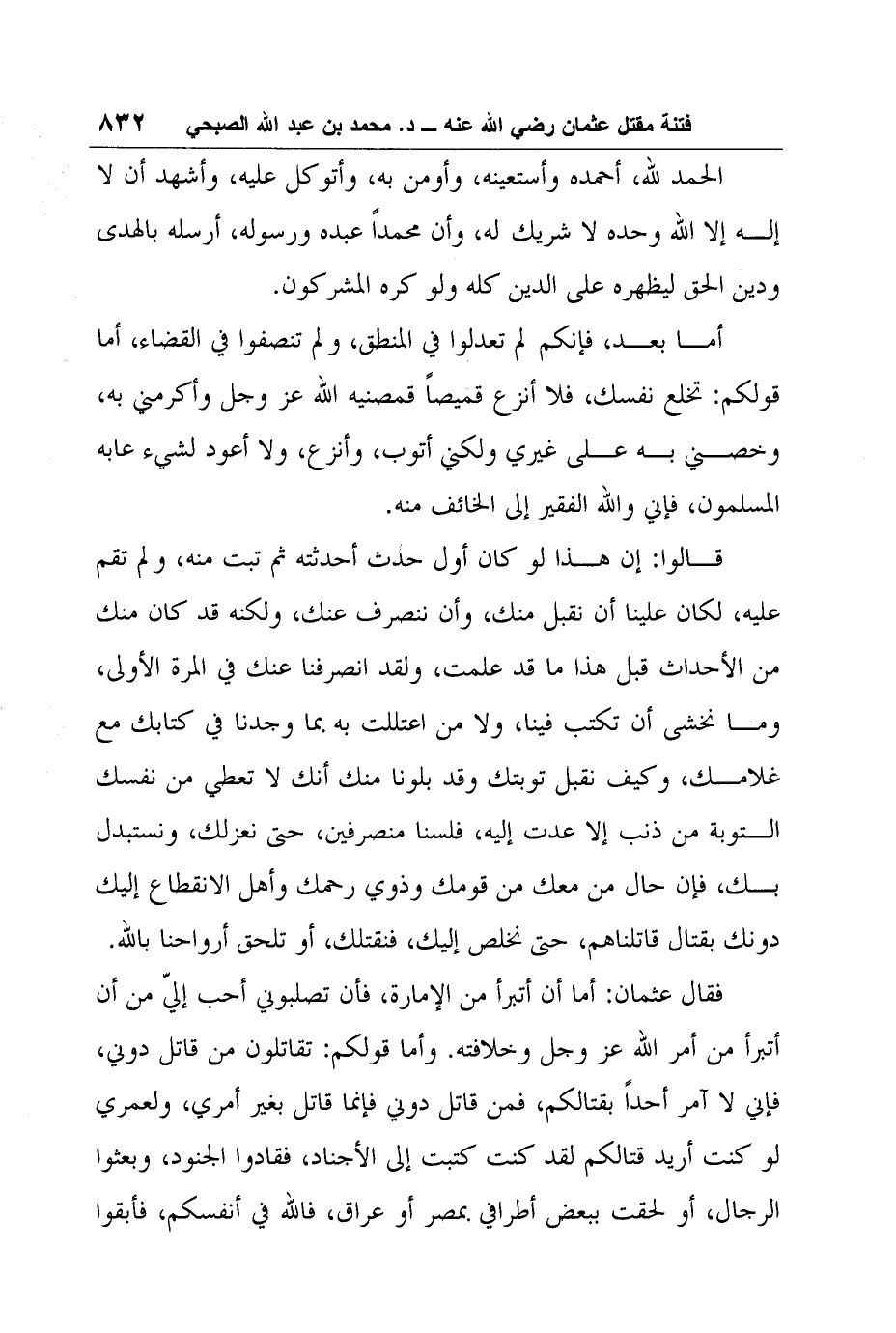 الحمد لله، أحمده وأستعينه، وأومن به، وأتوكل عليه، وأشهد أن لا إله إلا الله وحده لا شريك له، وأن محمداً عبده ورسوله، أرسله بالهدى ودين الحق ليظهره على الدين كله ولو كره المشركون. أما بعد، فإنكم لم تعدلوا في المنطق، ولم تنصفوا في القضاء، أما قولكم: تخلع نفسك، فلا أنزع قميصاً قمصنيه الله عز وجل وأكرمني به، وخصني به على غيري ولكني أتوب، وأنزع، ولا أعود لشيء عابه المسلمون، فإني والله الفقير إلى الخائف منه. قالوا: إن هذا لو كان أول حدث أحدثته ثم تبت منه، ولم تقم عليه، لكان علينا أن نقبل منك، وأن ننصرف عنك، ولكنه قد كان منك من الأحداث قبل هذا ما قد علمت، ولقد انصرفنا عنك في المرة الأولى، وما نخشى أن تكتب فينا، ولا من اعتللت به بما وجدنا في كتابك مع غلامك، وكيف نقبل توبتك وقد بلونا منك أنك لا تعطي من نفسك التوبة من ذنب إلا عدت إليه، فلسنا منصرفين، حتى نعزلك، ونستبدل بك، فإن حال من معك من قومك وذوي رحمك وأهل الانقطاع إليك دونك بقتال قاتلناهم، حتى نخلص إليك، فنقتلك، أو تلحق أرواحنا بالله. فقال عثمان: أما أن أتبرأ من الإمارة، فأن تصلبوني أحب إليّ من أن أتبرأ من أمر الله عز وجل وخلافته. وأما قولكم: تقاتلون من قاتل دوني، فإني لا آمر أحداً بقتالكم، فمن قاتل دوني فإنما قاتل بغير أمري، ولعمري لو كنت أريد قتالكم لقد كنت كتبت إلى الأجناد، فقادوا الجنود، وبعثوا الرجال، أو لحقت ببعض أطرافي بمصر أو عراق، فالله في أنفسكم، فأبقوا